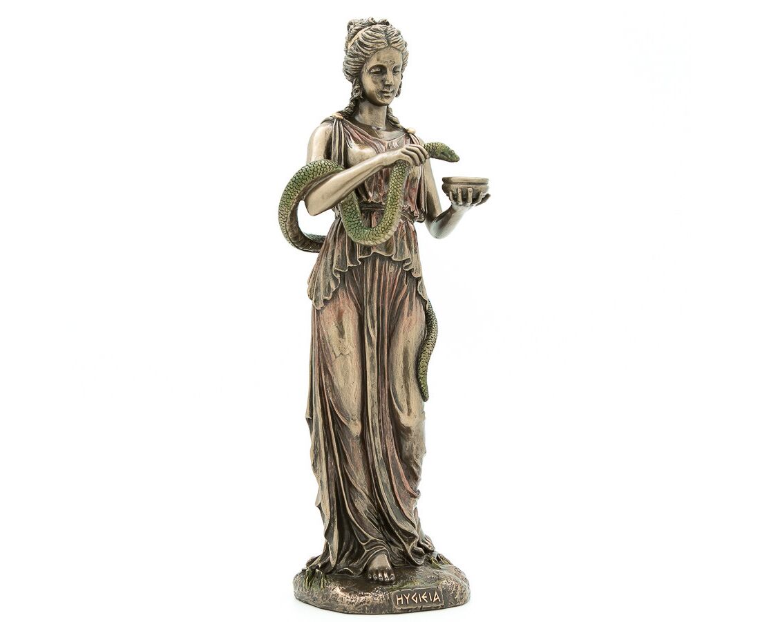 Гигиея - богиня здоровья Древней Греции. Эту богиню изображают как молодую девушку кормящую змею из чаши, что и стало символом современным медицины. Благодаря ней появилось такая медицинская дисциплина как гигиена. Статуэтка "Гигея - богиня здоровья" станет отличным подарком врачу, медсестре и всем, кто связан с медициной. Так же она займет достойное место в кабинете врача или в фойе больницы. Статуэтка изготовлена из полистоуна (искусственного камня) и покрыта бронзовым напылением. Упакована в красивую подарочную упаковку. Так что, покупая эту статуэтку вы покупаете ценный и красивый подарок, не требующий дополнения. VERONESE