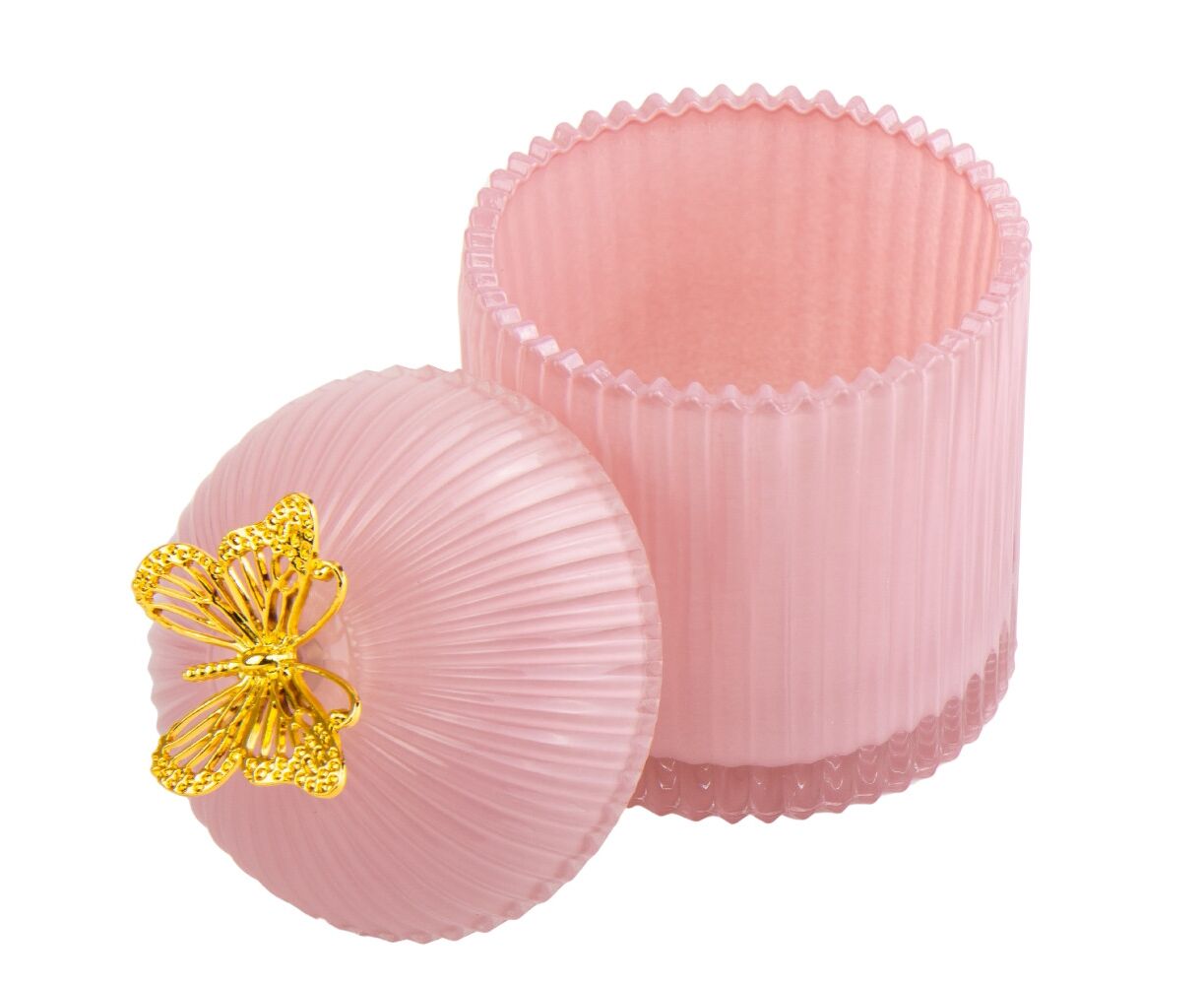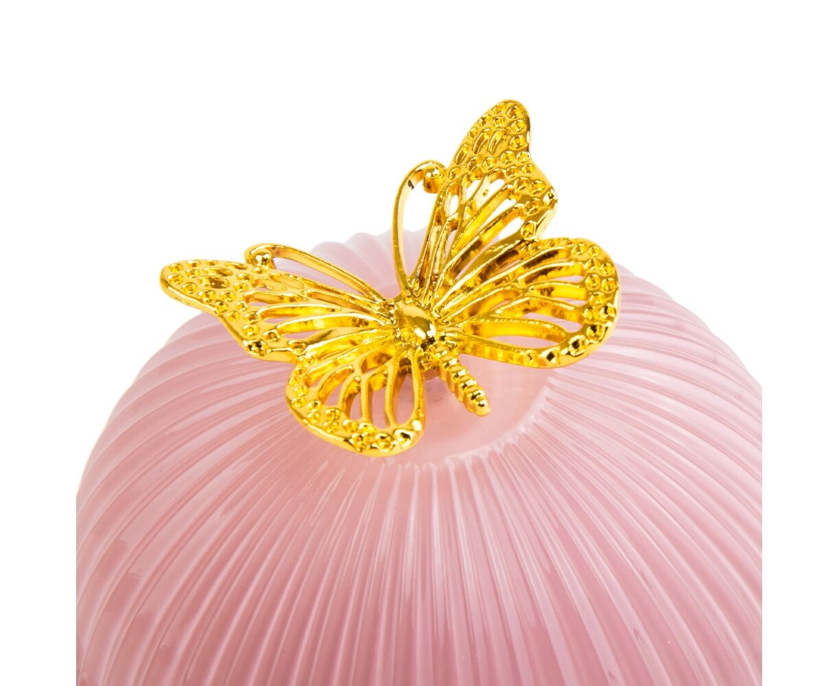 Стеклянная шкатулка с бабочкой – элегантное и стильное решение для эстетического хранения украшений и других важных безделушек. Это сочетание качества, эстетики и функциональности. Шкатулка изготовлена с вниманием к деталям, из высококачественного прозрачного стекла, защищающего украшения от пыли, влажности и других негативных факторов, которые могут повлиять на их качество и вид. Закрывается шкатулка с помощью стеклянной крышки, декорированной металлической золотой бабочкой. Тщательно отшлифованные углы и блики света придают шикарности этой шкатулке, напоминая о красоте скрываемых драгоценностей. Диаметр шкатулки – 9,5 см, высота – 16,5 см. Упакована в белую картонную коробку.