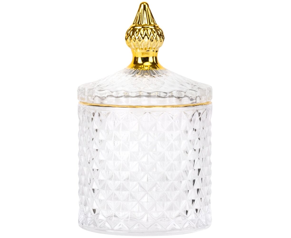Материал: Стекло Высота: 11 Ширина: 7.5 Высота с крышкой - 11 см, высота без крышки - 5,5 см, диаметр - 7,5 см. Изысканная стеклянная ёмкость для хранения с крышкой в форме короны, украшенная утончённым рельефным узором. Её поверхность красиво отражает свет, создавая...