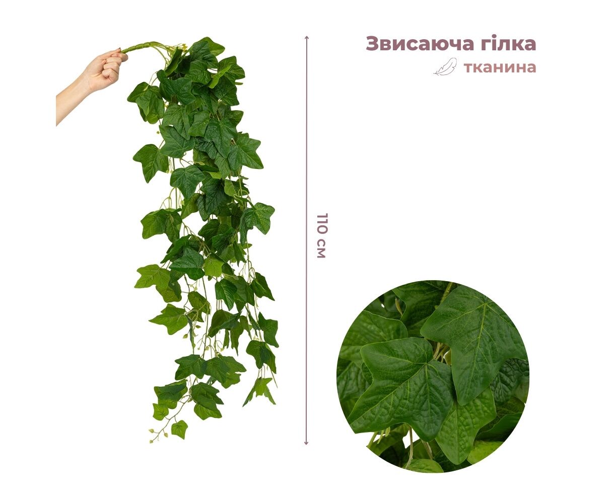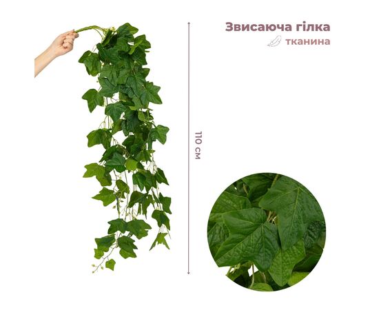 Искусственная свисающая ветка "Плющ", зеленая, 110 см