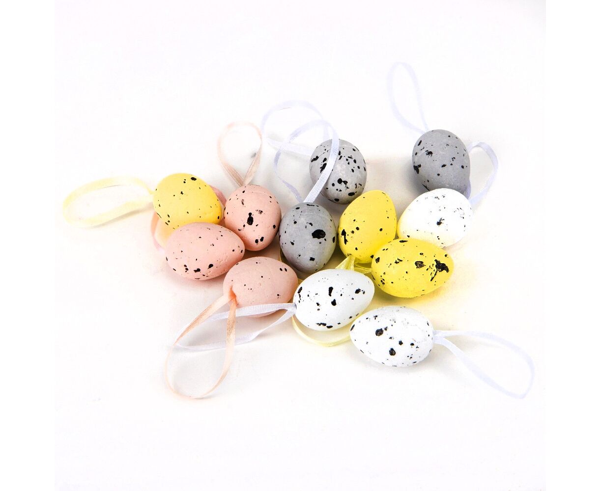 Длина пасхальных яиц - 3,5 см, с лентой - 9 см. В наборе 12 шт. Набор цветных пасхальных яиц - это не только стильный элемент декора, но и прекрасный способ создать праздничное настроение. Изготовленные из пластика, эти пасхальные яйца имеют яркие и насыщенные цвета. Легкие в уходе и очень практичные, они станут отличным дополнением к пасхальному декору в кафе, фотостудиях, витринах магазинов или дома!