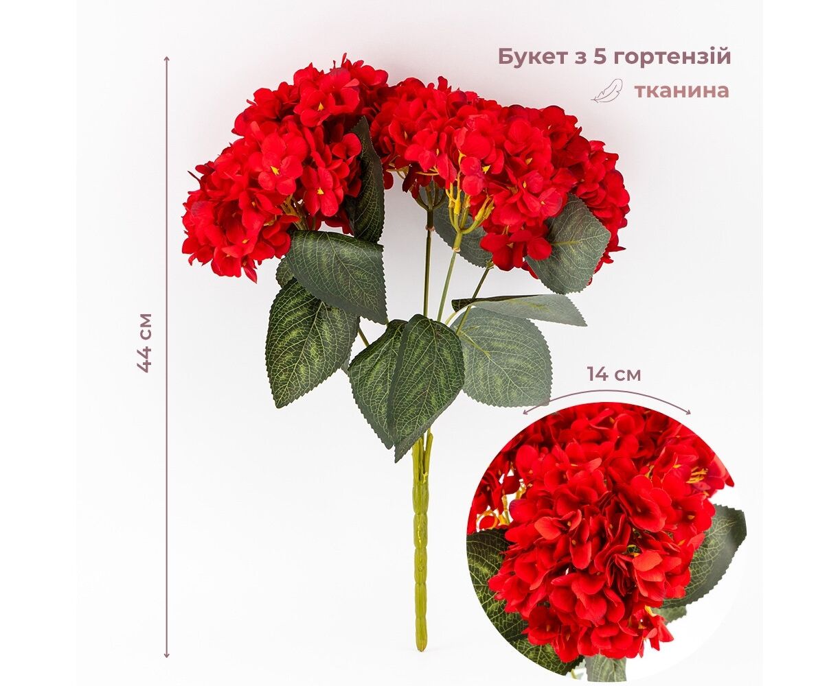 Букет гортензий, 5 бутонов, красный, 44 см