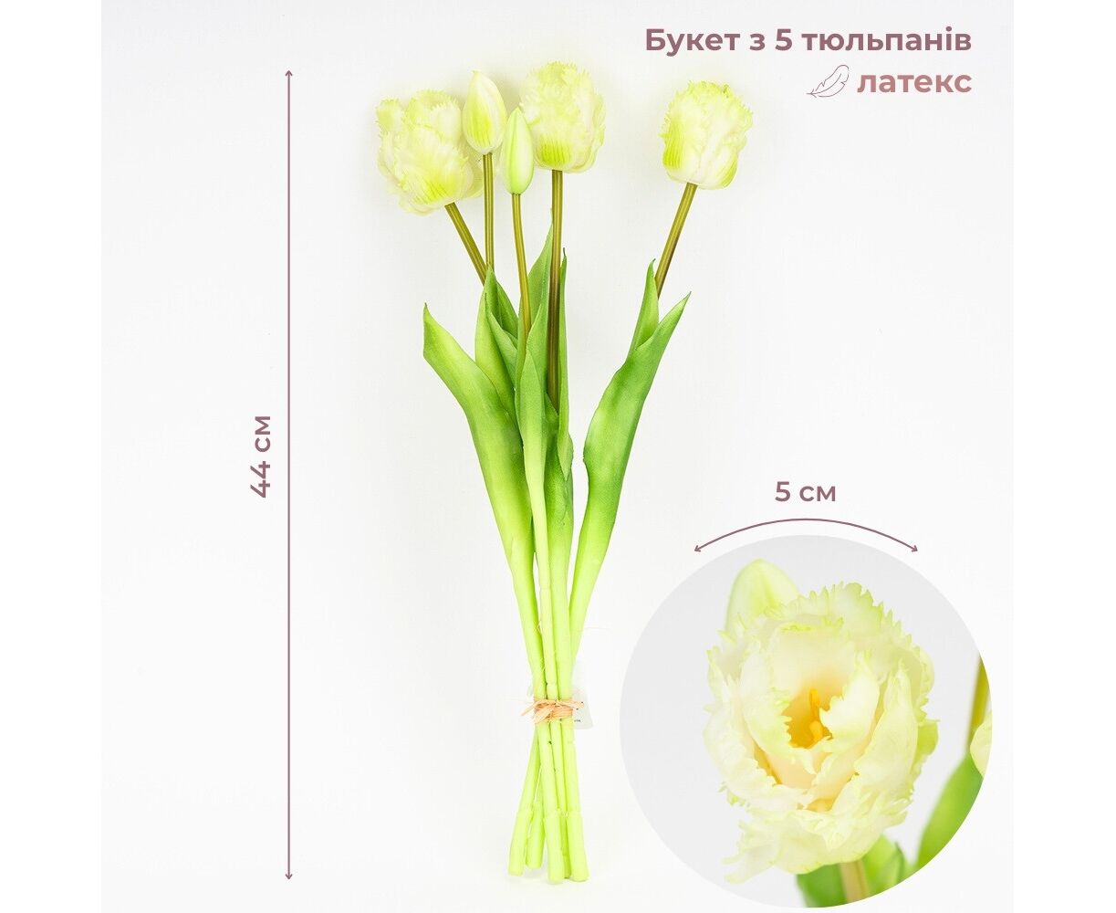 Букет из 5 тюльпанов. Высота букета – 44 см, диаметр бутона – 5 см. Изготовлен из латекса. Букет тюльпанов из латекса – изящная композиция, поражающая своей реалистичностью, максимально точно воспроизводя вид живых цветов. Форма бутонов напоминает редкий сорт тюльпанов с «инием» на лепестках — края выглядят как слегка припыленные морозом, с характерной фактурой и естественной неровностью, характерной настоящим цветам. Благодаря этому тюльпаны имеют живой, естественный вид и создают эффект только что срезанного букета. Такая особая форма делает композицию изысканной и правдоподобной, идеальной для декора праздничных мероприятий, фотостудий, витрин магазинов, кафе и интерьерных композиций. Букет сохраняет привлекательный вид в течение длительного времени без ухода.