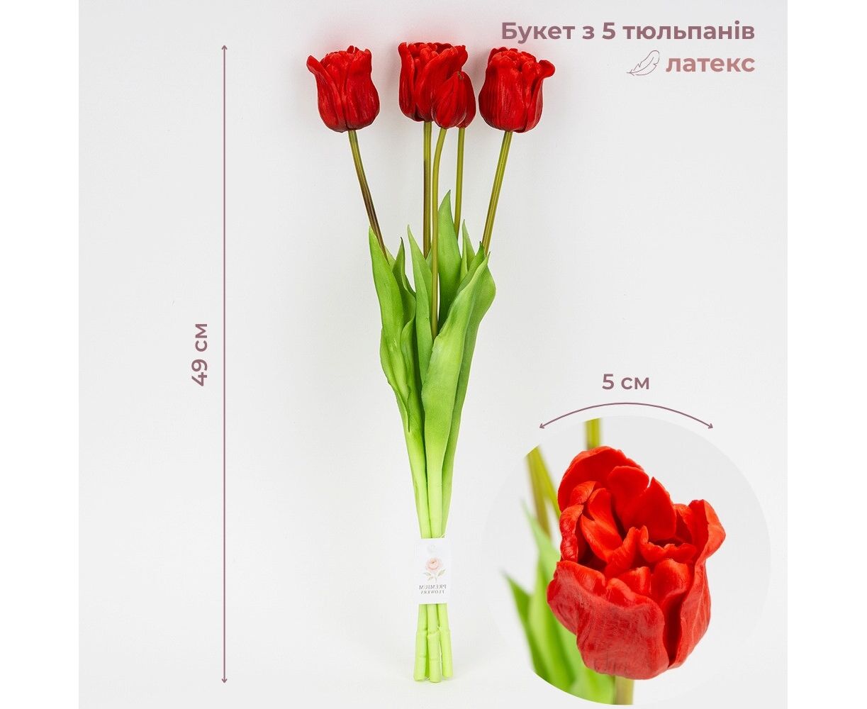 Букет из 5 тюльпанов. Высота букета – 49 см, диаметр бутона – 5 см. Изготовлен из латекса. Букет тюльпанов из латекса – изящная композиция, поражающая своей неповторимой красотой и реалистичностью, воспроизводя живые цветы с большой детализацией. Такой букет является идеальным вариантом для создания декоративных композиций, декорирования праздничных мероприятий, фотостудий, витрин магазинов, кафе! Букет останется свежим и привлекательным в течение длительного времени без чрезмерного ухода.