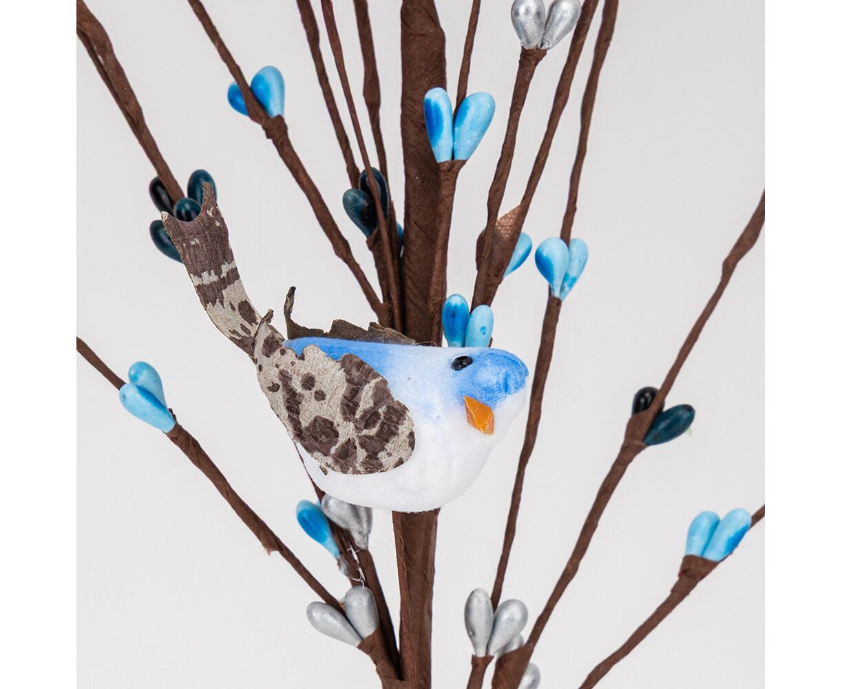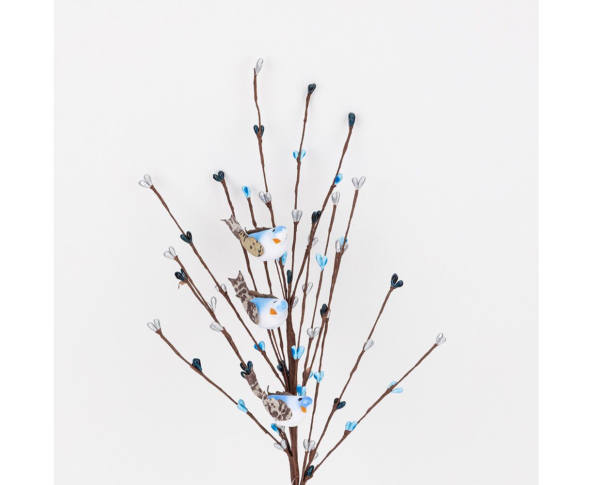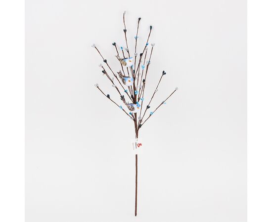 Высота — 50 см. Декоративная веточка «Птички» — изысканный элемент весеннего декора, наполняющий пространство легкостью и нежностью. Тонкая разветвленная основа, украшенная миниатюрными голубыми и серебристыми бутонами, создает утонченный фон для главного акцента — реалистичных фигурок птичек в небесно-голубых оттенках. Веточка идеально подходит для создания праздничных пасхальных инсталляций, украшения высоких ваз или в качестве оригинального дополнения к подарочным корзинам. Благодаря сдержанной и в то же время нарядной палитре, этот декор будет гармонично смотреться в витринах магазинов, интерьерах кафе и тематических фотозонах.