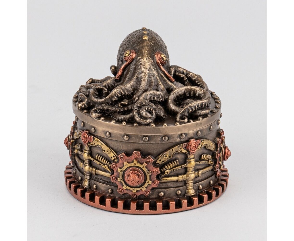 Шкатулка "Осьминог" выполнена в стиле стимпатик от известного бренда Veronese, станет оригинальным акцентом в интерьере и задаст неповторимую атмосферу. Осьминог – моллюск, который символизирует долголетие, возрождение и вечную жизнь. Все потому, что у него три сердца и он может наращивать раненые или утраченные конечности. Шкатулка изготовлена из полистоуна (искусственного камня) и покрыта бронзовым напылением. Запакована в пенопласт и красивую подарочную упаковку. VERONESE