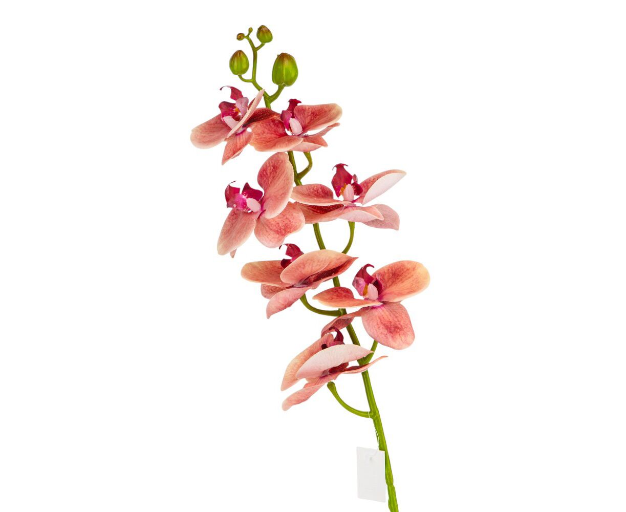 Высота – 75 см, ширина – 15 см. Диаметр цветка – 8,5 см. Цветы выполнены из просиликоненной ткани, стебли – из пластика. Искусственная ветвь орхидеи с изящными лепестками и реалистичными бутонами придает элегантности любому интерьеру. Цветок имеет грациозные изгибы и детализированную текстуру, максимально приближенную к живому растению. Идеально подходит для декора витрин, ресторанов или фотозон.