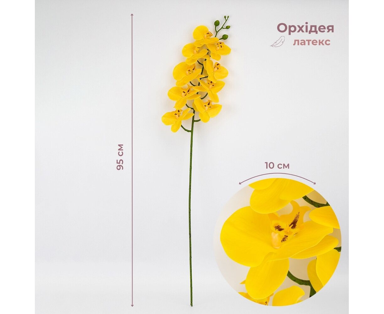 Высота – 95 см. Диаметр цветка – 10 см. Цветы выполнены из латекса, стебли – из пластика. Искусственная ветвь орхидеи с изящными лепестками и реалистичными бутонами придает элегантности любому интерьеру. Цветок имеет грациозные изгибы и детализированную текстуру, максимально приближенную к живому растению. Идеально подходит для декора витрин, ресторанов или фотозон.