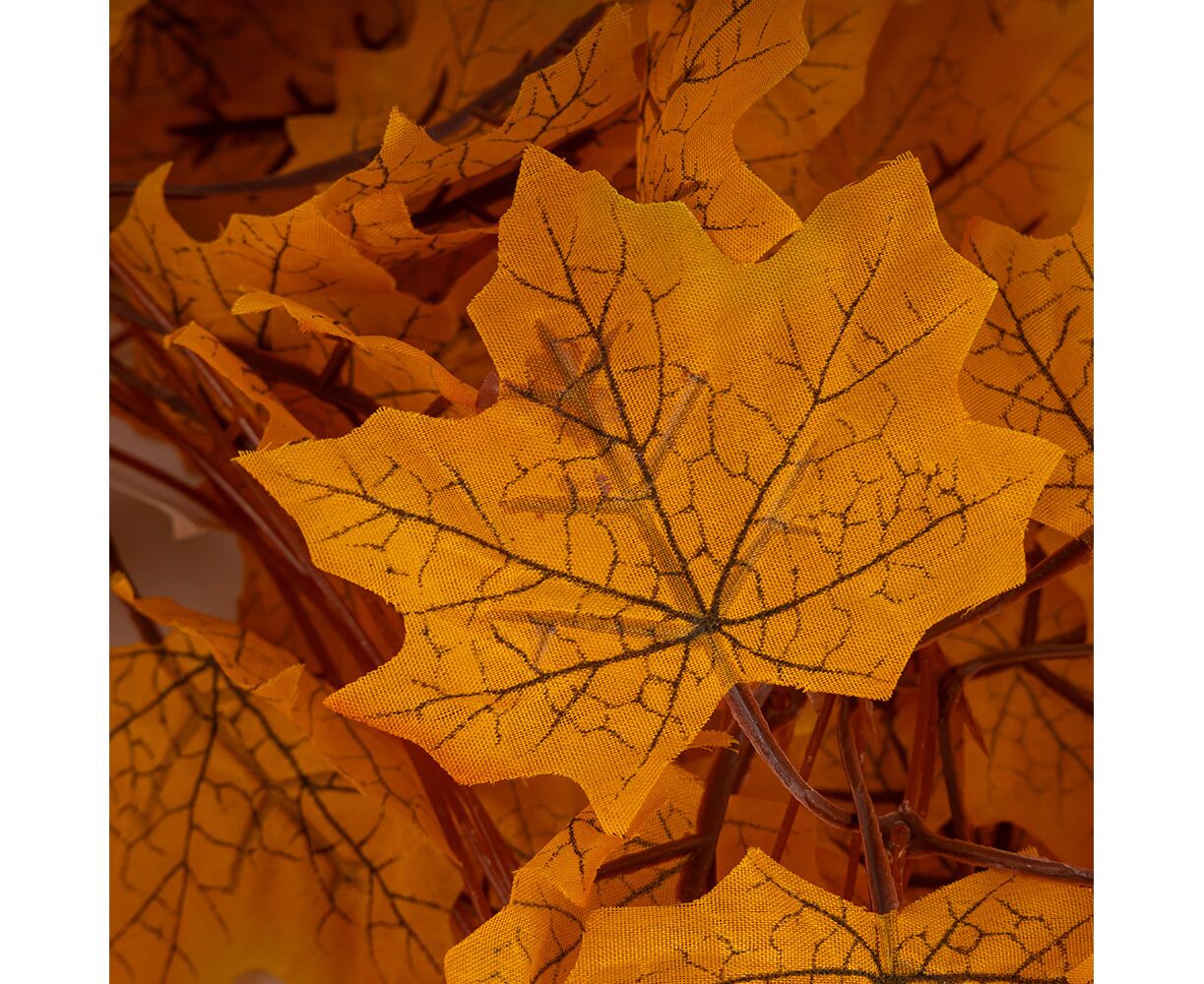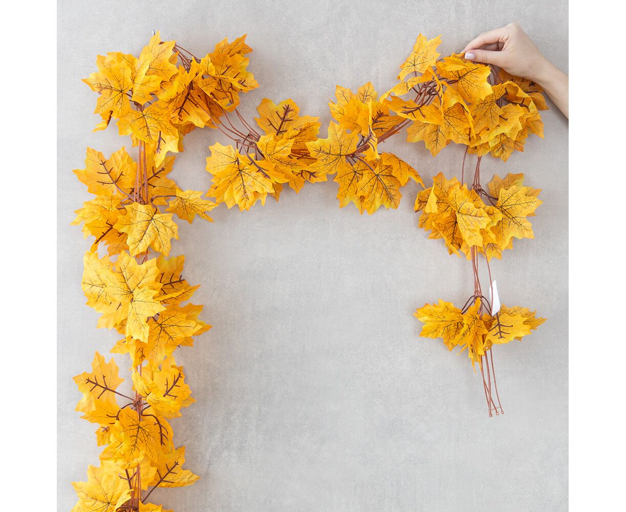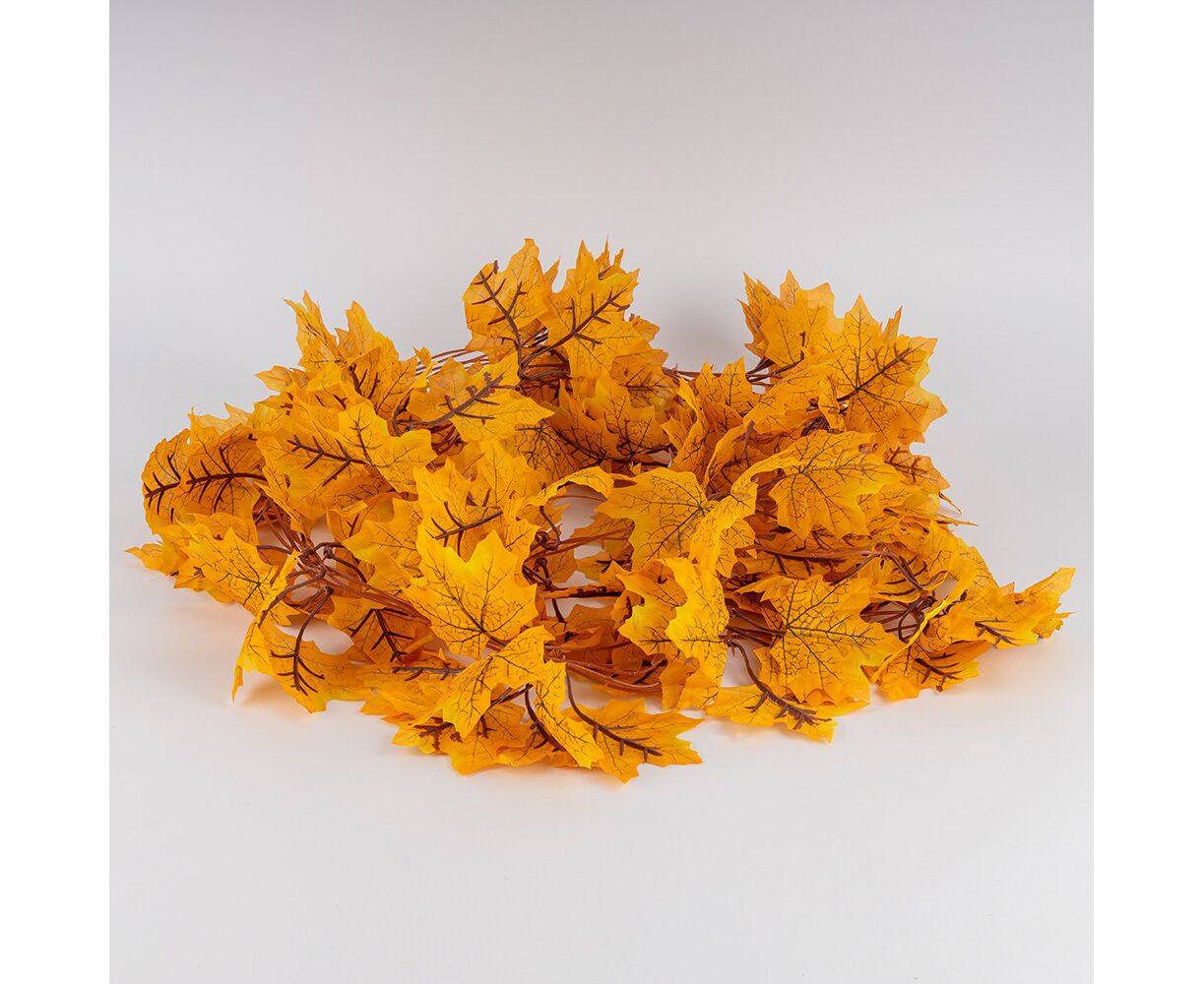 Длина - 240 см. Длина 1 листка - 9 см, ширина - 8 см. Гирлянда из реалистичных кленовых листьев в тёплой палитре золотисто-жёлтых и оранжевых оттенков. Идеально подходит для оформления сезонного декора в витринах, фотозонах или заведениях HoReCa. Благодаря естественному виду и приятному тёплому цвету, гирлянда добавляет уюта и жизнерадостности интерьеру. Высокое качество исполнения и гибкая основа делают её удобной в использовании для флористов и декораторов. Незаменимый элемент для создания солнечной осенней атмосферы.