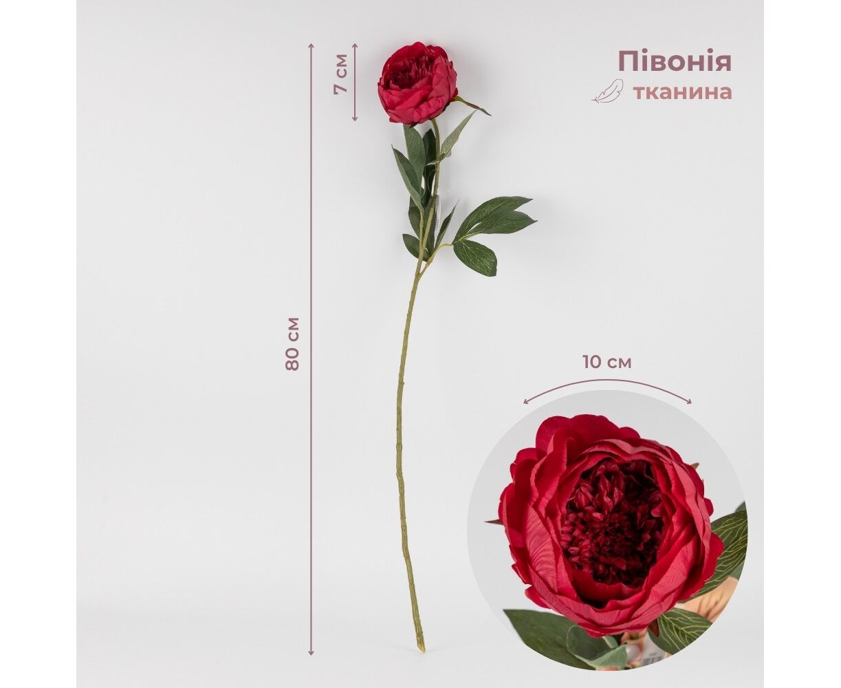Высота - 80 см. Высота 1 бутона - 7 см, диаметр - 10 см. Цветы выполнены из ткани, стебли — из пластика. Искусственные пионы имеют детализированные листья и бутоны с природной текстурой и характерной формой. Гибкий стебель позволяет легко менять расположение и придавать цветку желаемую форму, что делает его удобным для оформления интерьеров и флористических композиций. Подходит для создания декоративных аранжировок, озеленения помещений и фотозон.