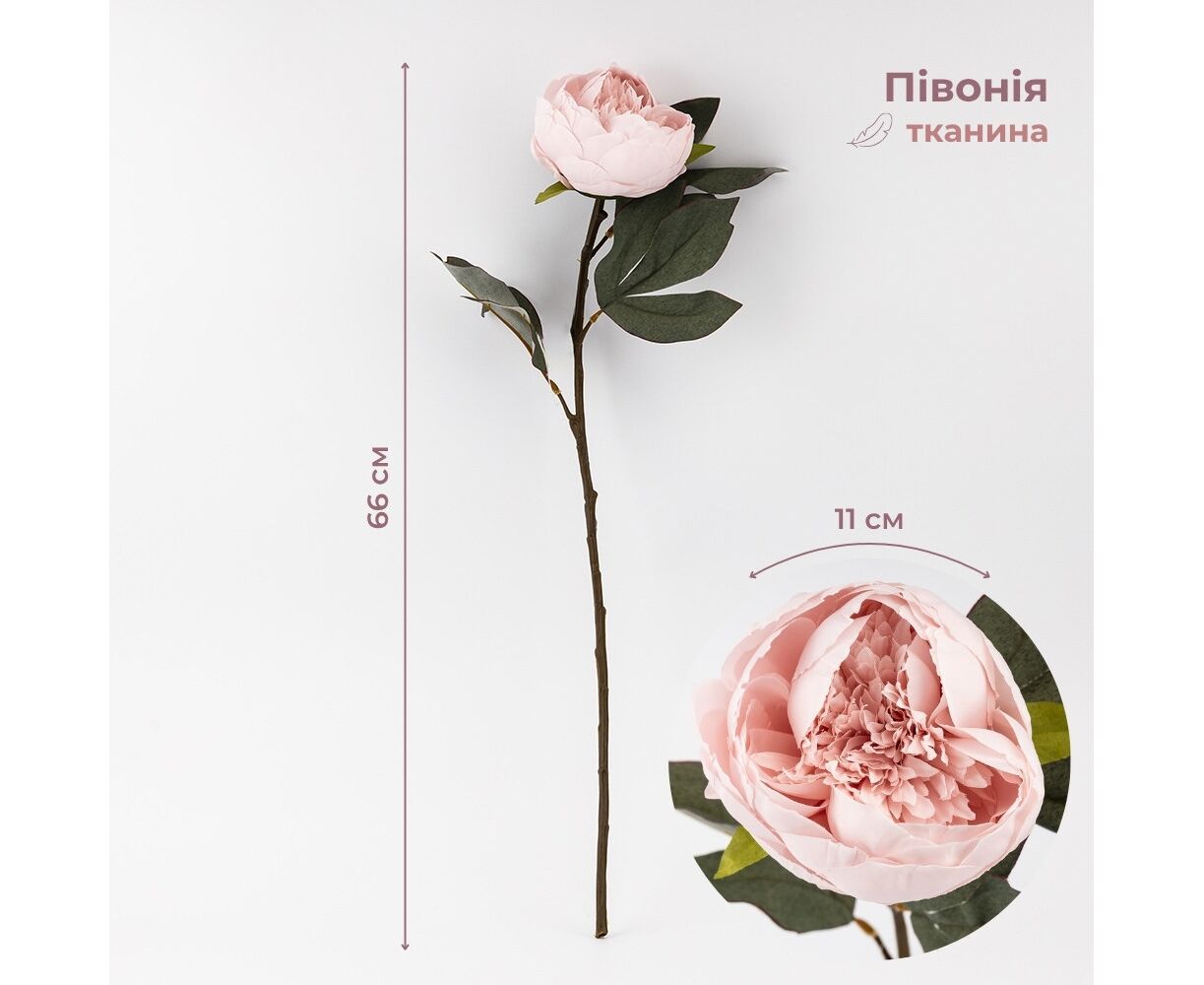 Высота - 66 см, диаметр бутона - 11 см. Цветы выполнены из ткани, стебли — из пластика. Искусственные пионы имеют детализированные листья и бутоны с природной текстурой и характерной формой. Гибкий стебель позволяет легко менять расположение и придавать цветку желаемую форму, что делает его удобным для оформления интерьеров и флористических композиций. Подходит для создания декоративных аранжировок, озеленения помещений и фотозон.
