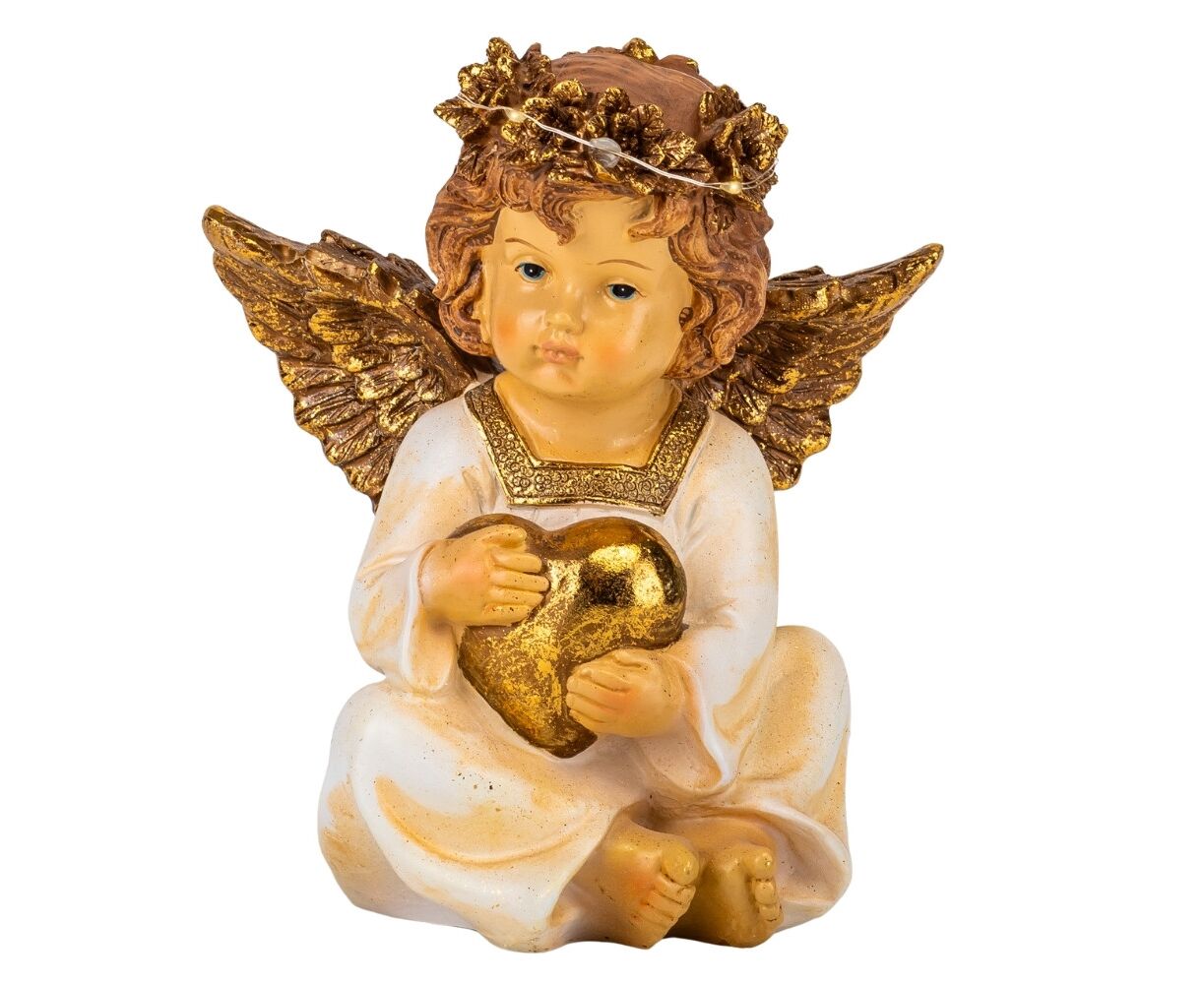 Статуэтка "Золотое Сердце" - это элегантный и символический декоративный элемент, высотой 19 см, изготовлен из полистоуна, что придает ей детализированный вид и долговечность. Статуэтка изображает ангела с нежными крыльями, украшенными золотом, обнимающим свое золотое сердце – символ чистоты, любви и защиты. У ангела изящный венок с подсветкой, который нежно сияет благодаря встроенному освещению, работающему от 2 батареек типа AAA. Подсветка придает статуэтке особый шарм, создавая теплую и уютную атмосферу. Эта статуэтка не только украсит любой интерьер, но и станет символом духовности, тепла и любви. Она идеально подойдет как для подарка, так и для праздничного декора, подчеркивая значимость внутреннего света и сердечной искренности.