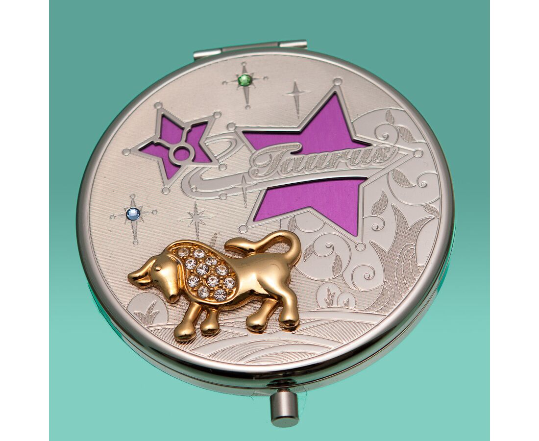 Стильное карманное зеркальце украшенное знаком Зодиака "Телец". Зеркальце может стать стильным подарком к любому празднику или просто так. Этот оригинальный подарок подойдет как бабушке, любимой маме так и подруге. Без зеркала каждая девушка, женщина чувствует себя, как без рук. С его помощью вы всегда будете в курсе, как выглядите, все ли в порядке с прической и макияжем. Маленькое зеркало полностью возмещает свои скромные габариты компактностью, мобильностью и изысканным внешним видом.