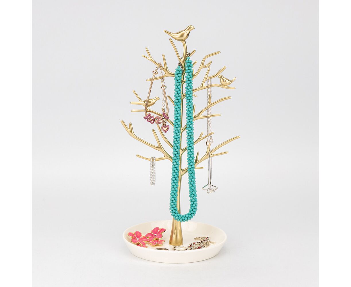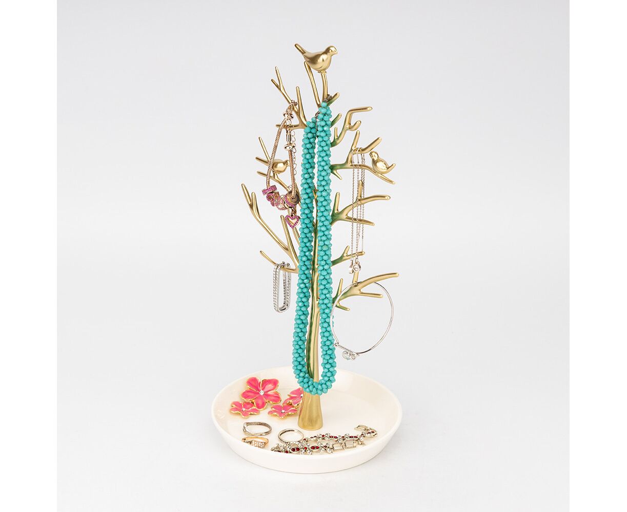 Высота — 32,5 см, диаметр — 14 см. Настольная подставка для украшений – настоящее воплощение элегантности и красоты. Изготовлена из металла с золотистым покрытием, она имеет утонченный дизайн, оттеняющий его блестящий вид. Подставка имеет разные отделения и крючки для размещения украшений любой формы и размера. Ее стильный дизайн, сочетающий классические формы с современными акцентами, придает виду не только функциональности, но и изысканности. Эта подставка – идеальное решение для организации и отображения вашей коллекции украшений, созданное, чтобы подчеркнуть красоту каждого предмета. Family Home Decor