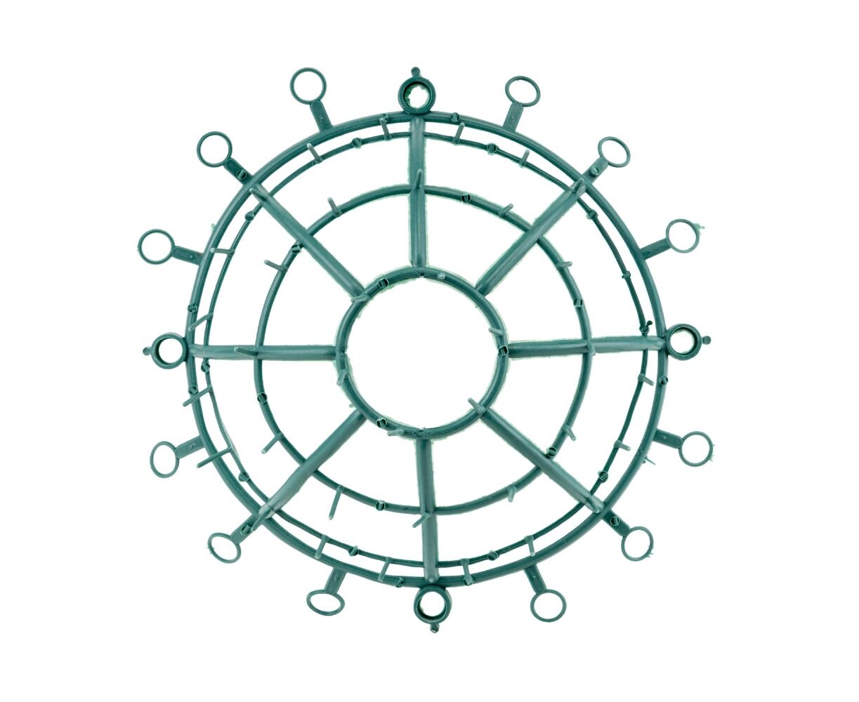 Диаметр — 20,5 см, высота — 9,5 см. Флористическая основа изготовлена из прочного зелёного пластика, имеет конструкцию с круговыми и радиальными рёбрами, которые обеспечивают надёжность и равномерное распределение декоративных элементов. По краям расположены фиксаторы для удобного крепления цветов или дополнительных элементов. С её помощью можно создавать объёмные цветочные композиции, оформлять подвесной или настенный декор. Эта форма идеально подходит для оформления фотозон или арок. Основа подходит как для профессиональных декораторов, так и для любительских проектов.