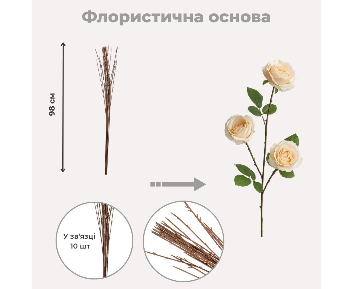 Высота — 98 см. В связке 10 шт. Флористическая основа в виде натуральных веточек — универсальное решение для оформления витрин, фотозон, свадебных арок или композиций в вазах. Элегантная форма и природная текстура придают декору глубину и динамичность. Идеально подходит для HoReCa и декораторов, которые создают атмосферу с помощью природных элементов. Может использоваться как самостоятельный акцент или как база для композиций.