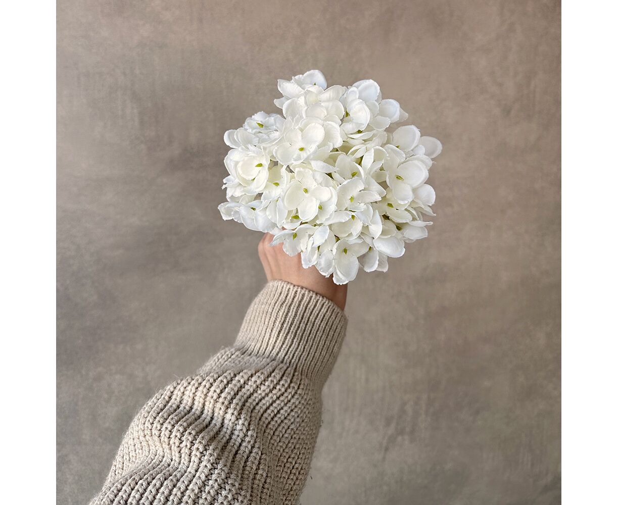 Диаметр – 14 см, высота – 10 см. Искусственная головка мелкоцветковой гортензии из нежного текстиля – это идеальное решение для флористов, декораторов и HORECA-сегмента. Богатый объем и природная фактура придают утонченность любому интерьеру или событию. Благодаря пластиковому хвостику ее удобно крепить к основаниям или композициям. Листья и бутон изготовлены из ткани, что создает максимально реалистичный вид. Идеально для оформления банкетов, фотозон, витрин и свадебного декора.