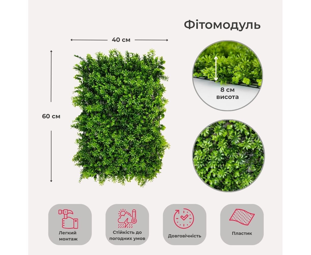 Длина панели – 60 см, ширина – 40 см, высота – 5 см. Декоративная панель из искусственной зелени – стильное решение для вертикального или горизонтального озеленения любого пространства. Реалистичные листья разных оттенков и текстур создают эффект живой растительности, придавая интерьеру свежести и природной гармонии. Фитомодуль имеет крепкую пластиковую основу с клипсами по краям, благодаря чему несколько элементов легко соединяются между собой в большую зеленую стену. Подходит для оформления интерьеров, витрин, фотозон, террас, зон отдыха, кафе, ресторанов и офисов. Может использоваться в помещении или на улице под накрытием, не требует ухода, не выцветает и сохраняет цвет в течение длительного времени. Идеальный вариант для тех, кто хочет создать атмосферу природы без усилий.