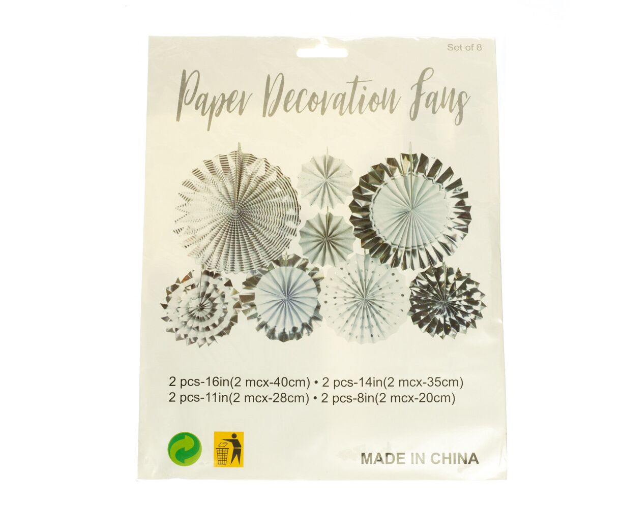 Набор з 8 бумажных вееров ,белый в серебрянный горох
