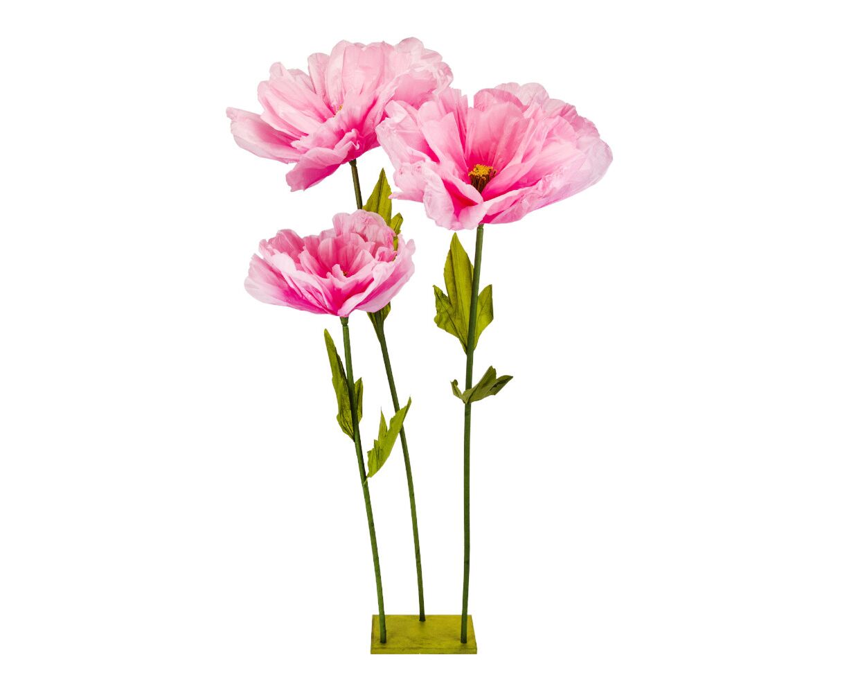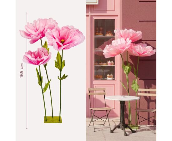 Высота – 165 см, диаметр бутона – 60 см. Размер подставки – 30 см*17 см. Ростовые декоративные цветы идеальны для профессионального декорирования витрин, фотозон и ивент-площадок. Конструкция разработана для многоразового использования: стебель устойчив, а подставка выполнена из прочного ПВХ, гарантируя надежную фиксацию. Лепестки из нежной гофрированной бумаги являются гибкими, позволяя быстро изменять их форму при монтаже. Весь комплект доставляется в разобранном виде, что значительно оптимизирует логистику и значительно упрощает хранение между проектами. Этот декор представляет собой выгодное решение для быстрого и эффектного оформления пространств.