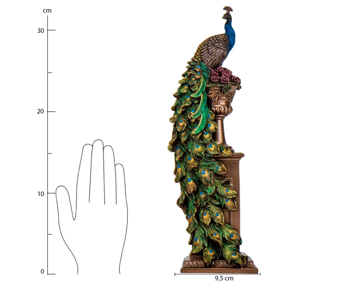Высота статуэтки - 34 см, диаметр подставки - 9,5 см. Статуэтка Veronese изготовлена из полистоуна (искусственного камня) и покрыта бронзовым напылением. Павлин - это утонченная и красивая птица, которая ассоциируется с красотой, гордостью и утонченностью. Статуэтка павлина изображает эту птицу с большим хвостом и яркими цветами оперения, что символизирует его красоту и элегантность. Статуэтка павлина может быть прекрасным подарком для тех, кто ценит красоту, элегантность и утонченность. Она может служить символом гордости и высокого статуса, а также объектом для декорирования помещения или рабочего стола. Упакована в красивую подарочную коробку. Поэтому, покупая эту статуэтку, Вы получаете ценный и красивый подарок, который не требует дополнения. Благодаря надежной внутренней упаковке, изготовленной из пенопласта с углублениями для мельчайших деталей, Вы можете быть уверены в безопасности при транспортировке. VERONESE