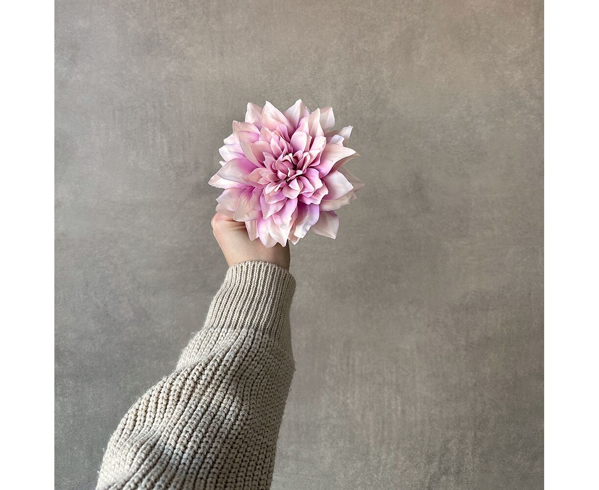 Диаметр - 15 см, высота - 6 см. Искусственная головка георгины с объемным бутоном из ткани станет элегантным акцентом для оформления праздничных локаций, банкетов или фотозон. флористов благодаря своей универсальности и натуральному виду.