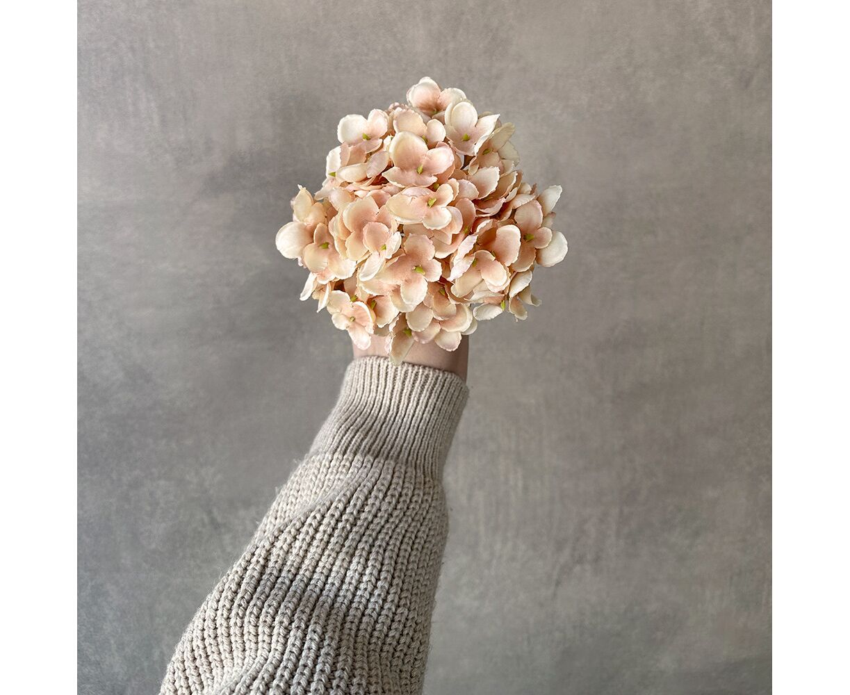 Диаметр – 14 см, высота – 10 см. Искусственная головка мелкоцветковой гортензии из нежного текстиля – это идеальное решение для флористов, декораторов и HORECA-сегмента. Богатый объем и природная фактура придают утонченность любому интерьеру или событию. Благодаря пластиковому хвостику ее удобно крепить к основаниям или композициям. Листья и бутон изготовлены из ткани, что создает максимально реалистичный вид. Идеально для оформления банкетов, фотозон, витрин и свадебного декора.