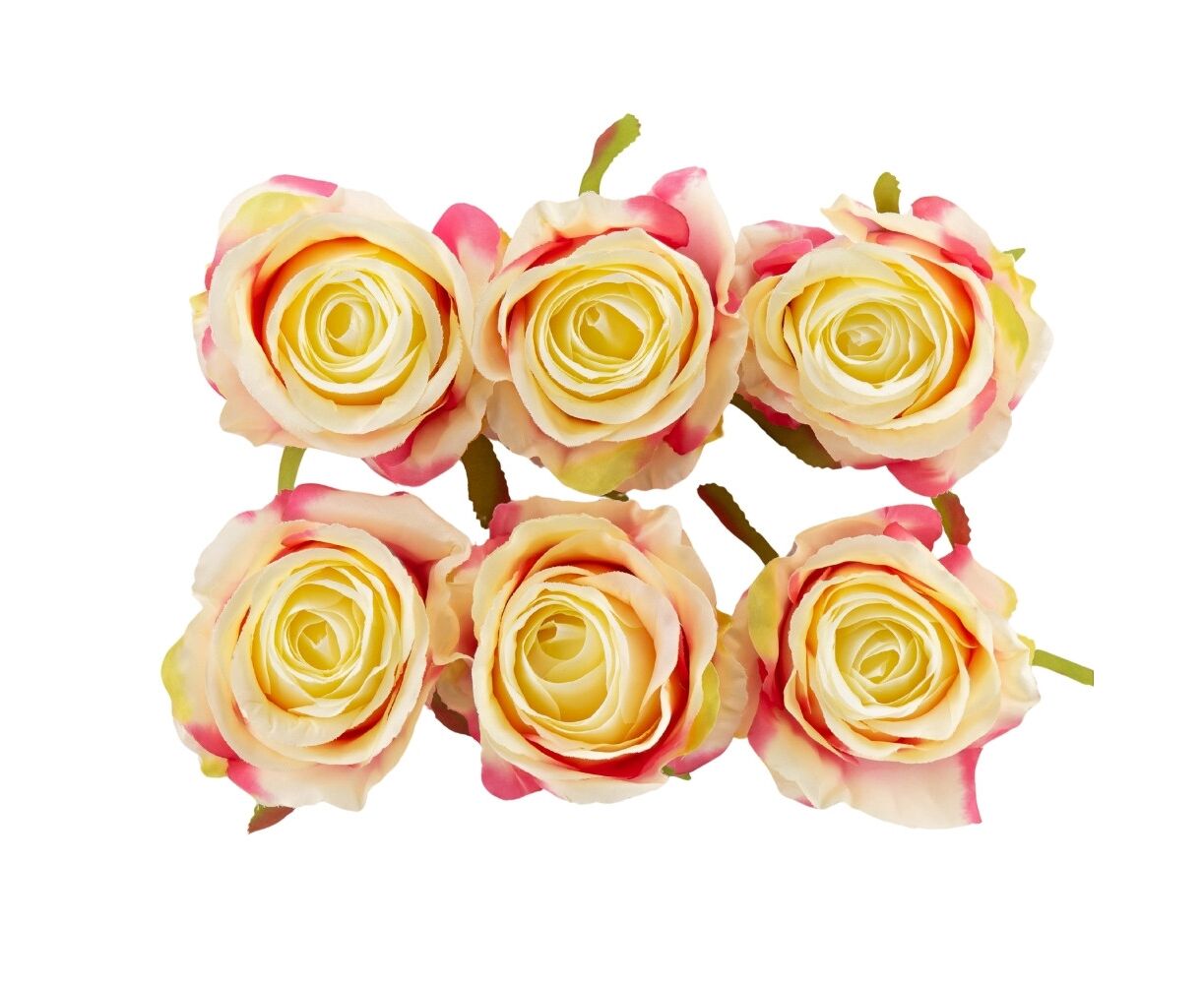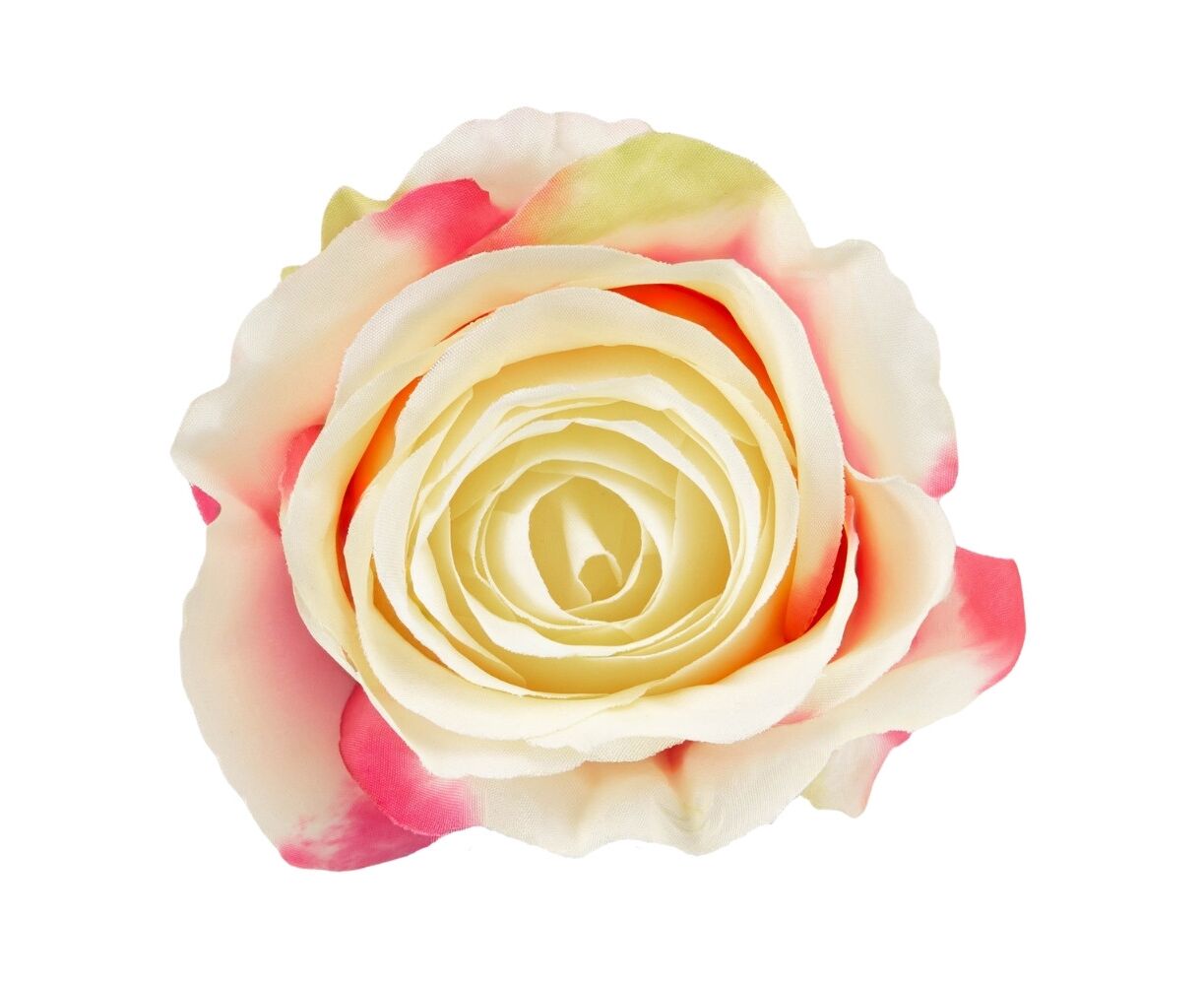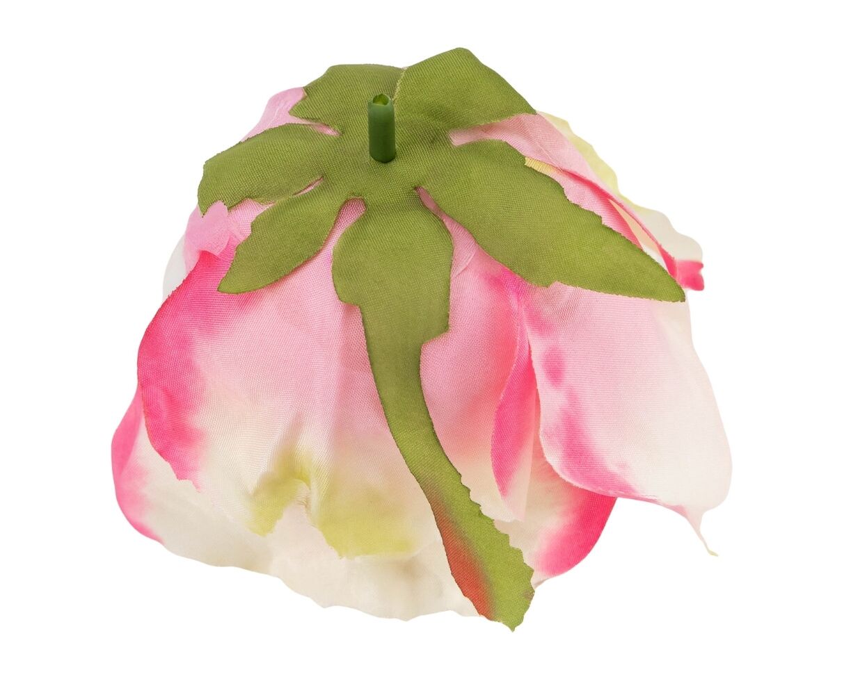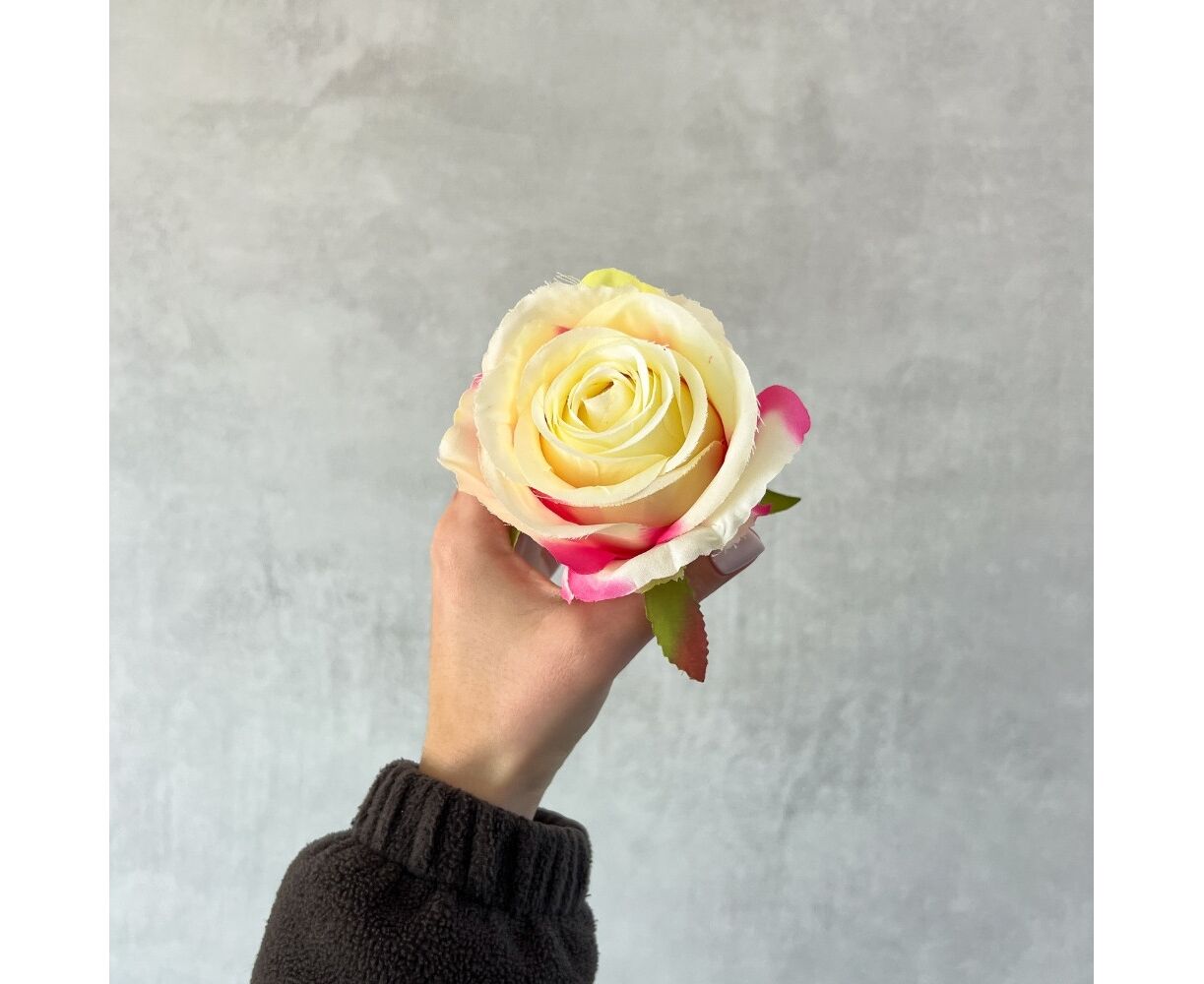 Искусственная головка розы диаметром 8 см изготовлена ​​из качественной ткани, имитирующей натуральные лепестки. Пластиковый хвостик позволяет удобно крепить бутон к разным поверхностям или декорациям.