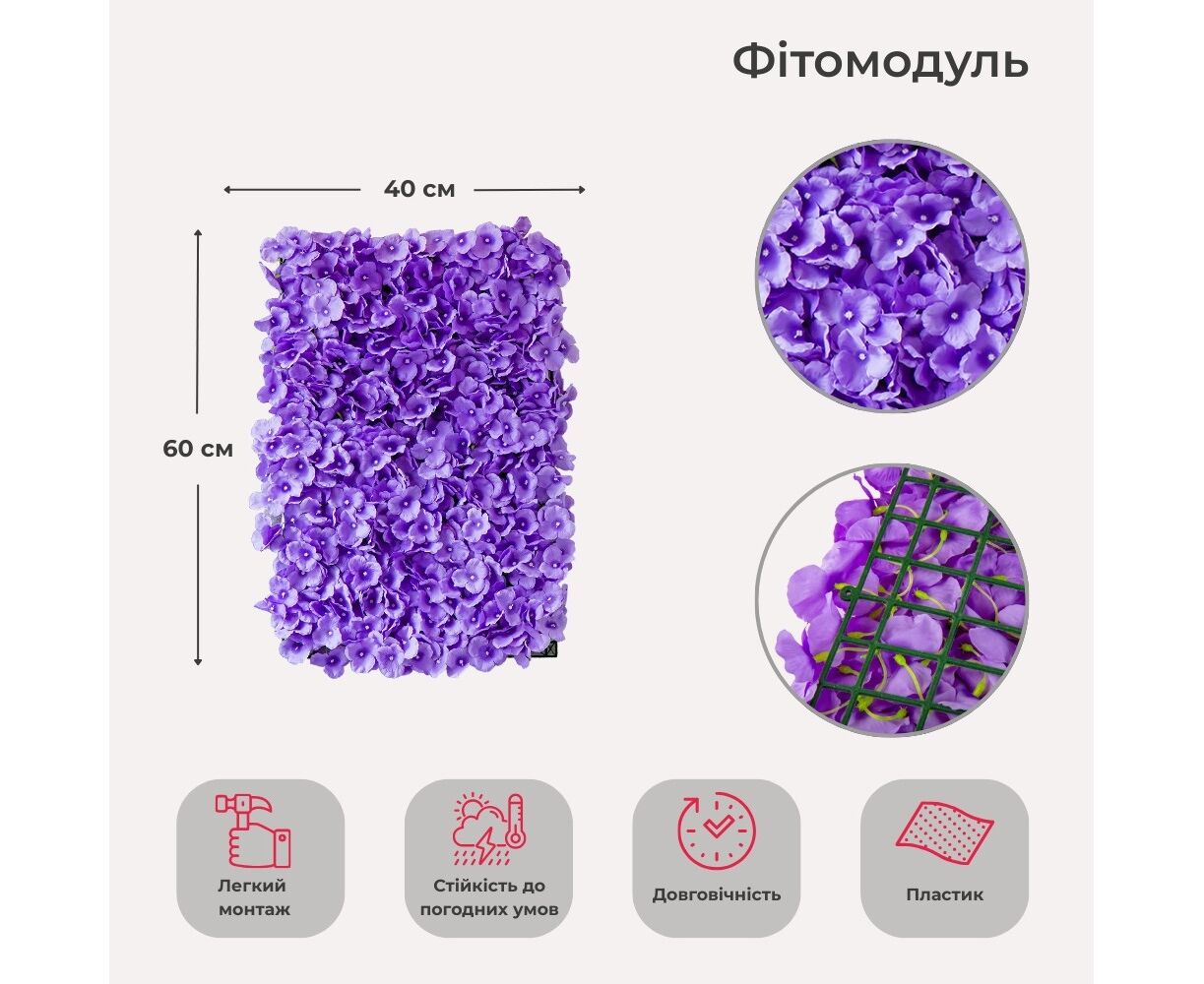 Искусственный фитомодуль из цветов "Гортензия", сиреневая, 40*60 см