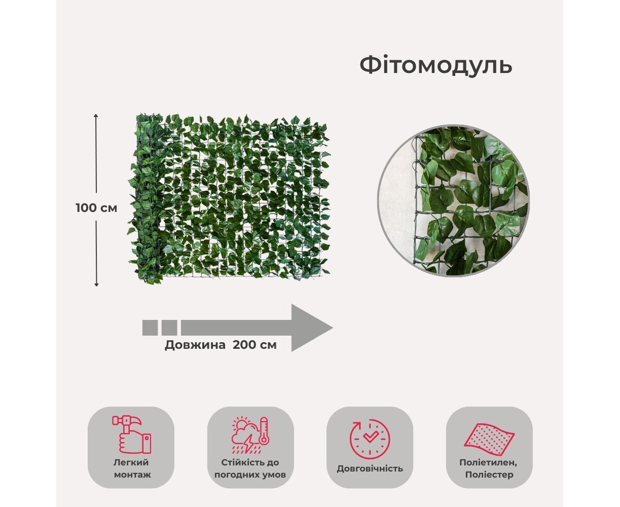 Длина покрытия – 200 см, ширина – 100 см, высота – 2 см. Декоративное модульное покрытие с реалистичными листьями на основе из прочного полиэтилена – это универсальное решение для озеленения интерьера и экстерьера. Листья изготовлены из полиэстера, имеют естественную форму и приятную текстуру, что создает эффект живой зеленой стены. Гибкая сетка позволяет удобно монтировать панель на любые поверхности – стены, ограждения, фасады или перегородки. Такое покрытие придает простору свежести, уюту и визуально оживляет даже самую простую плоскость. Идеально для оформления кафе, салонов, фотозон, витрин или придомовых территорий.