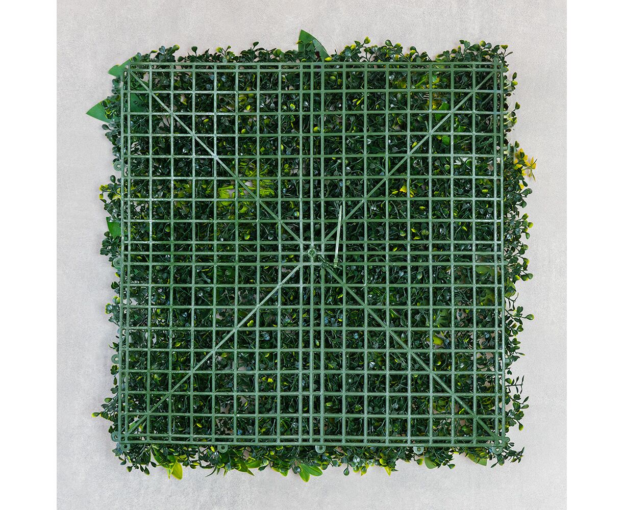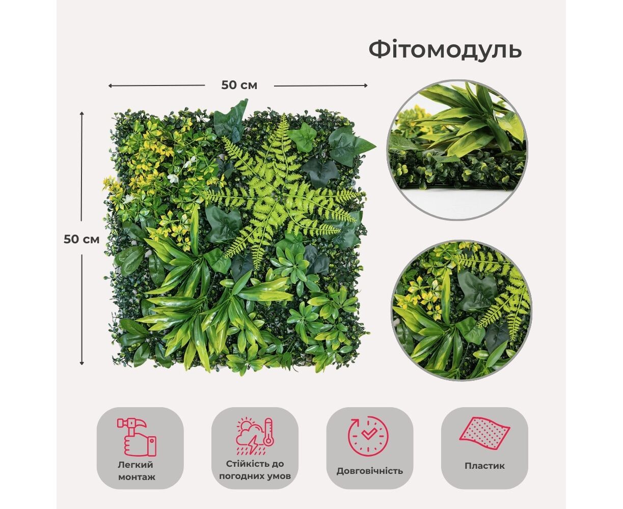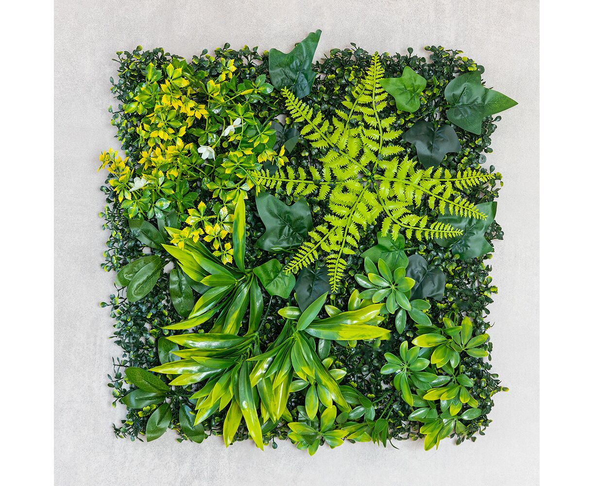 Длина панели – 50 см, ширина – 50 см, высота – 6 см. Декоративная панель из искусственной зелени – стильное решение для вертикального или горизонтального озеленения любого пространства. Реалистичные листья разных оттенков и текстур создают эффект живой растительности, придавая интерьеру свежести и природной гармонии. Фитомодуль имеет крепкую пластиковую основу с клипсами по краям, благодаря чему несколько элементов легко соединяются между собой в большую зеленую стену. Подходит для оформления интерьеров, витрин, фотозон, террас, зон отдыха, кафе, ресторанов и офисов. Может использоваться в помещении или на улице под накрытием, не требует ухода, не выцветает и сохраняет цвет в течение длительного времени. Идеальный вариант для тех, кто хочет создать атмосферу природы без усилий.