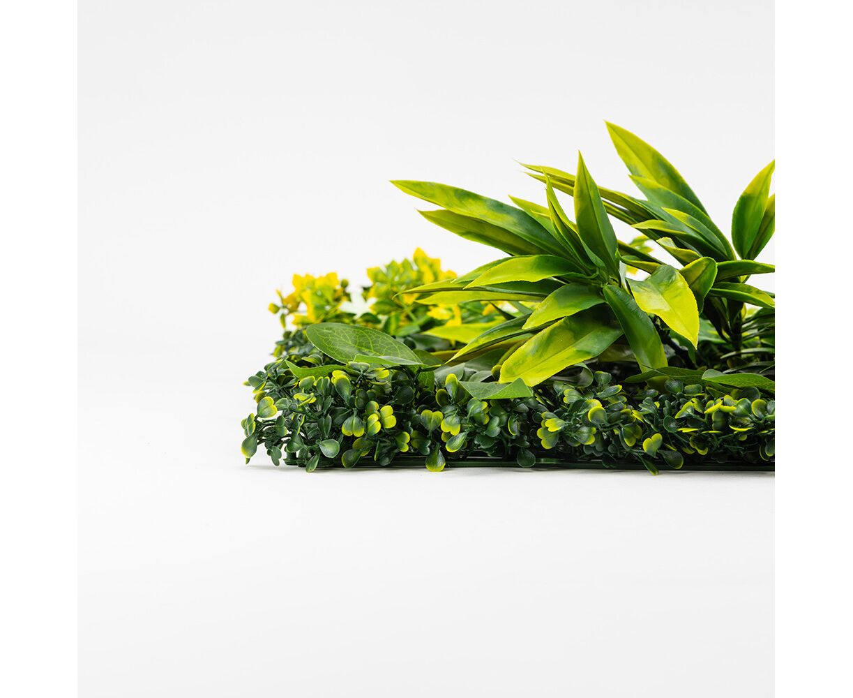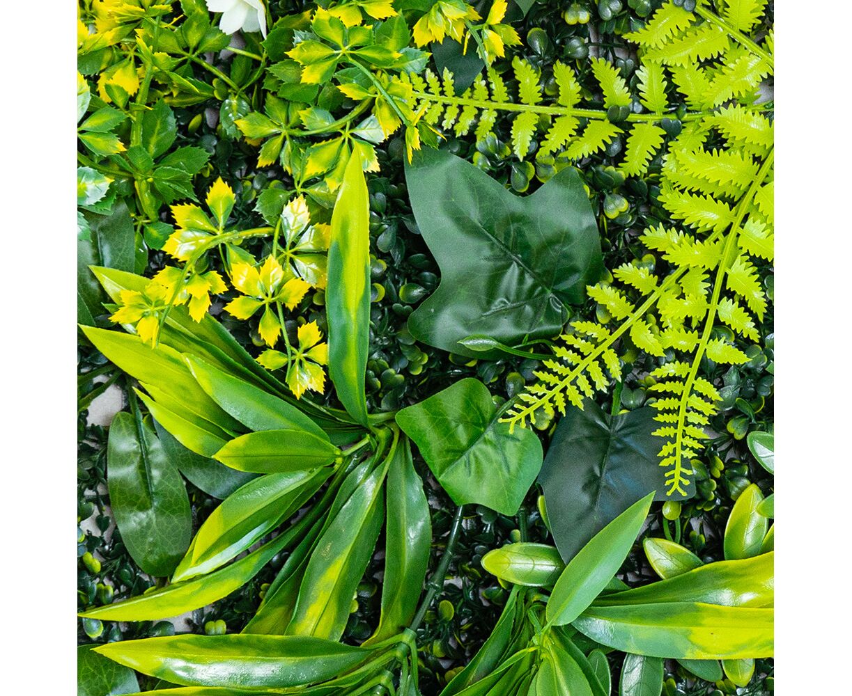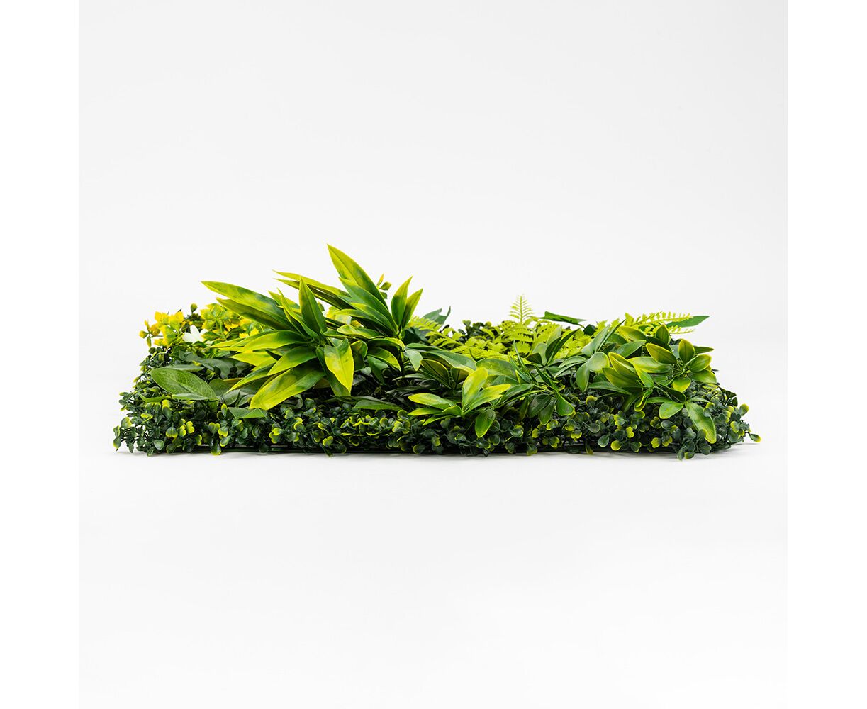 Длина панели – 50 см, ширина – 50 см, высота – 6 см. Декоративная панель из искусственной зелени – стильное решение для вертикального или горизонтального озеленения любого пространства. Реалистичные листья разных оттенков и текстур создают эффект живой растительности, придавая интерьеру свежести и природной гармонии. Фитомодуль имеет крепкую пластиковую основу с клипсами по краям, благодаря чему несколько элементов легко соединяются между собой в большую зеленую стену. Подходит для оформления интерьеров, витрин, фотозон, террас, зон отдыха, кафе, ресторанов и офисов. Может использоваться в помещении или на улице под накрытием, не требует ухода, не выцветает и сохраняет цвет в течение длительного времени. Идеальный вариант для тех, кто хочет создать атмосферу природы без усилий.