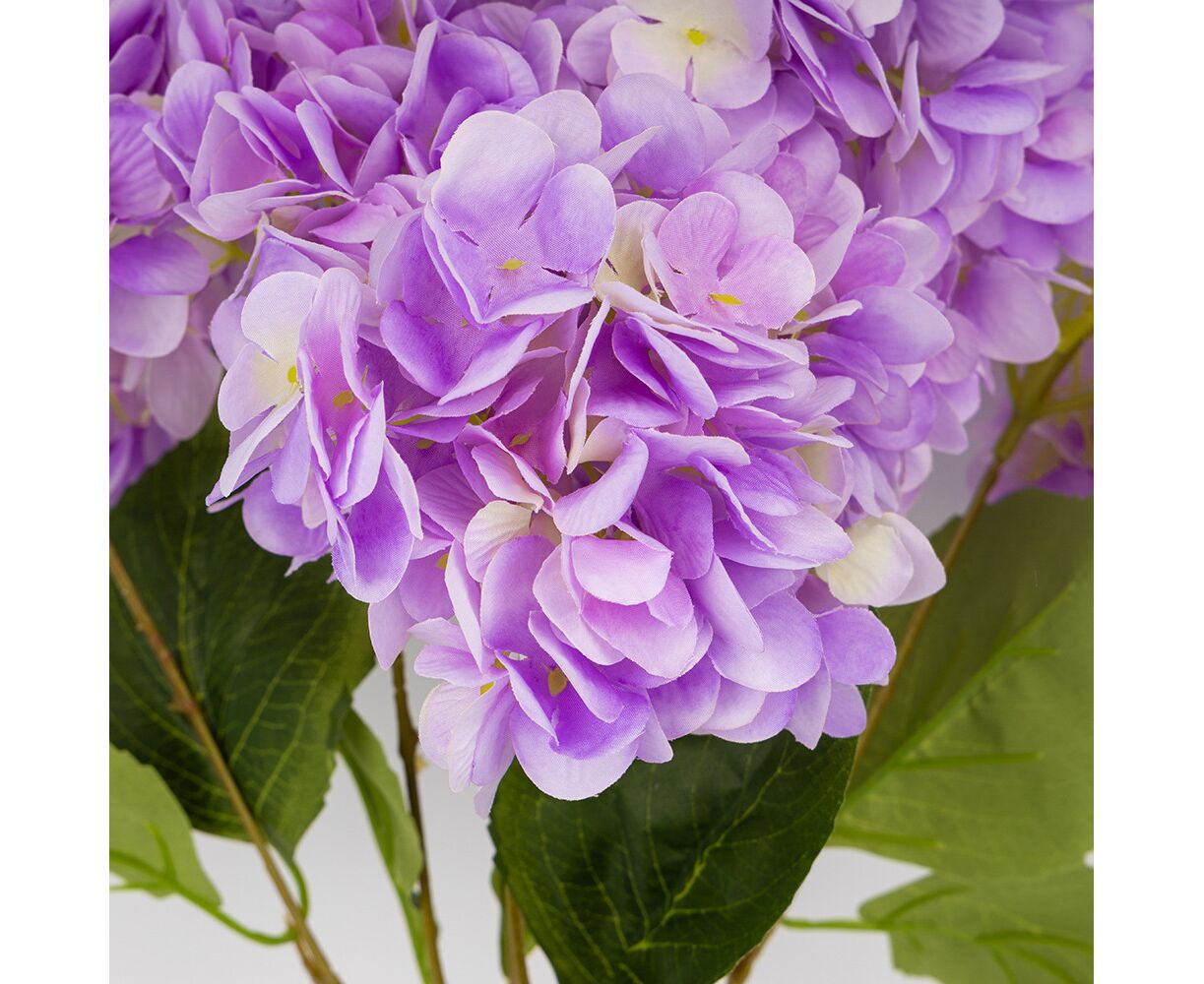 Высота – 48 см, диаметр бутона – 13 см. В букете 5 бутонов. Цветы выполнены из ткани, стебли – из пластика. Искусственный букет гортензий с объемными соцветиями выглядит естественно и изящно. Декоративные листья придают композиции натуральности, делая ее идеальным выбором для интерьера или праздничного оформления. Благодаря качественным материалам цветы не теряют форму и вид, не требуя ухода.