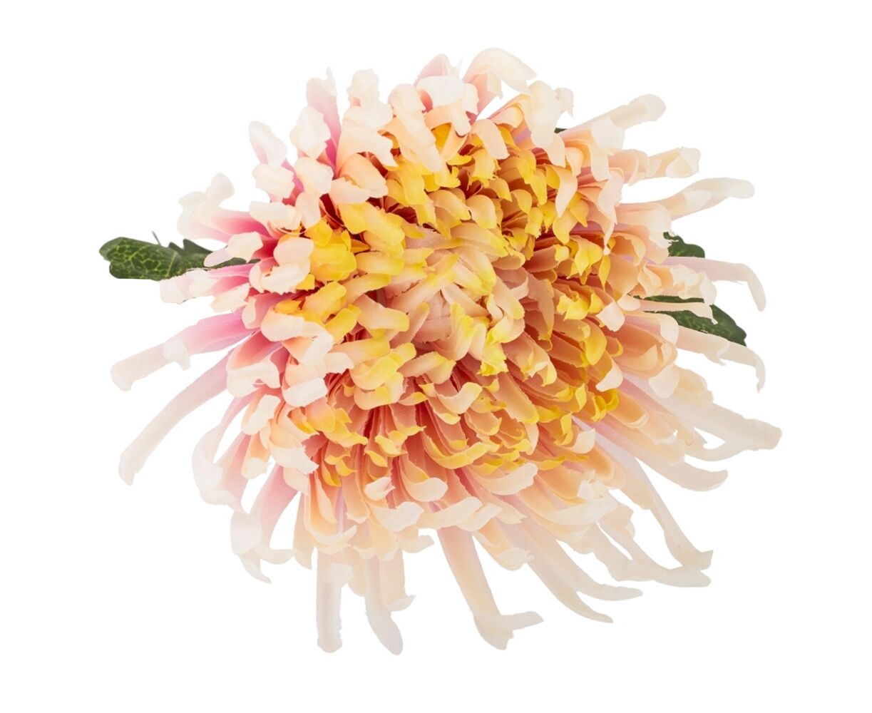 Искусственная хризантема выглядит очень реалистично и имеет элегантный, утонченный вид. Ее большие лепестки, выполненные из высококачественных материалов, имеют мягкую текстуру. Бутон хризантемы выглядит объемным, а лепестки расположены в несколько слоев, формируя раскрытый цветок, напоминающий живой. Листья — зеленые, с изящными формами, которые дополняют общий образ, придавая натуральности. Стебель выполнен из прочного материала, обеспечивает стабильность и надежность. Искусственная хризантема не требует специального ухода, сохраняя свой вид и яркость цветов в течение длительного времени. Она станет отличным дополнением к любому интерьеру, идеально подходящий для оформления праздников, букетов или декора в вазах.