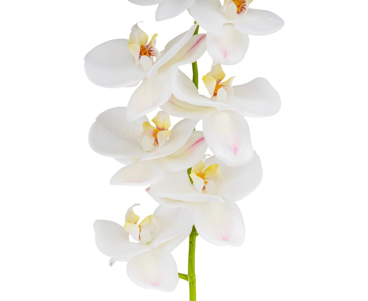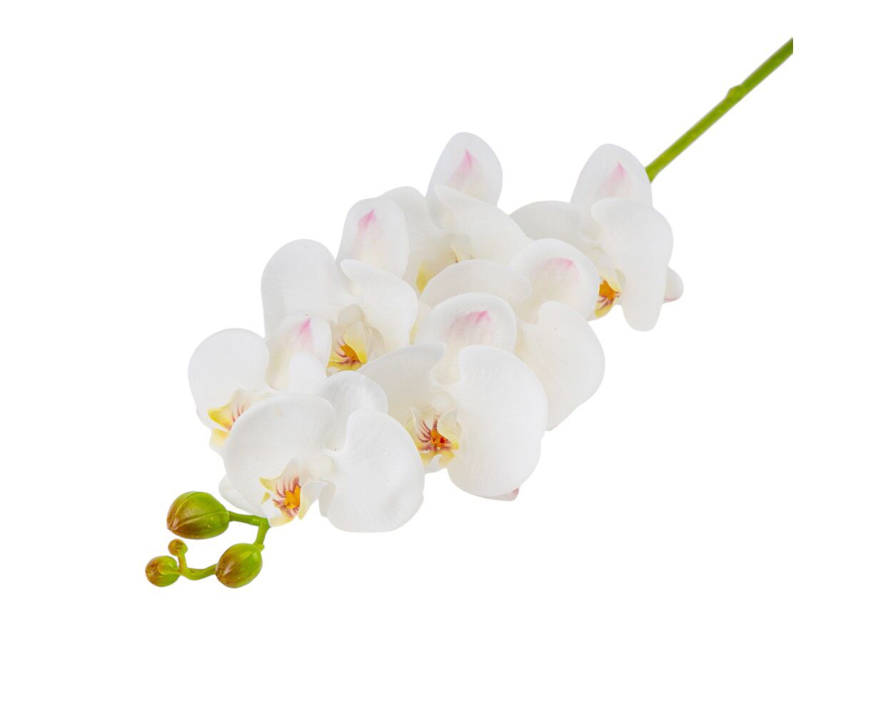 Высота – 75 см, ширина – 15 см. Диаметр цветка – 8,5 см. Цветы выполнены из просиликоненной ткани, стебли – из пластика. Искусственная ветвь орхидеи с изящными лепестками и реалистичными бутонами придает элегантности любому интерьеру. Цветок имеет грациозные изгибы и детализированную текстуру, максимально приближенную к живому растению. Идеально подходит для декора витрин, ресторанов или фотозон.