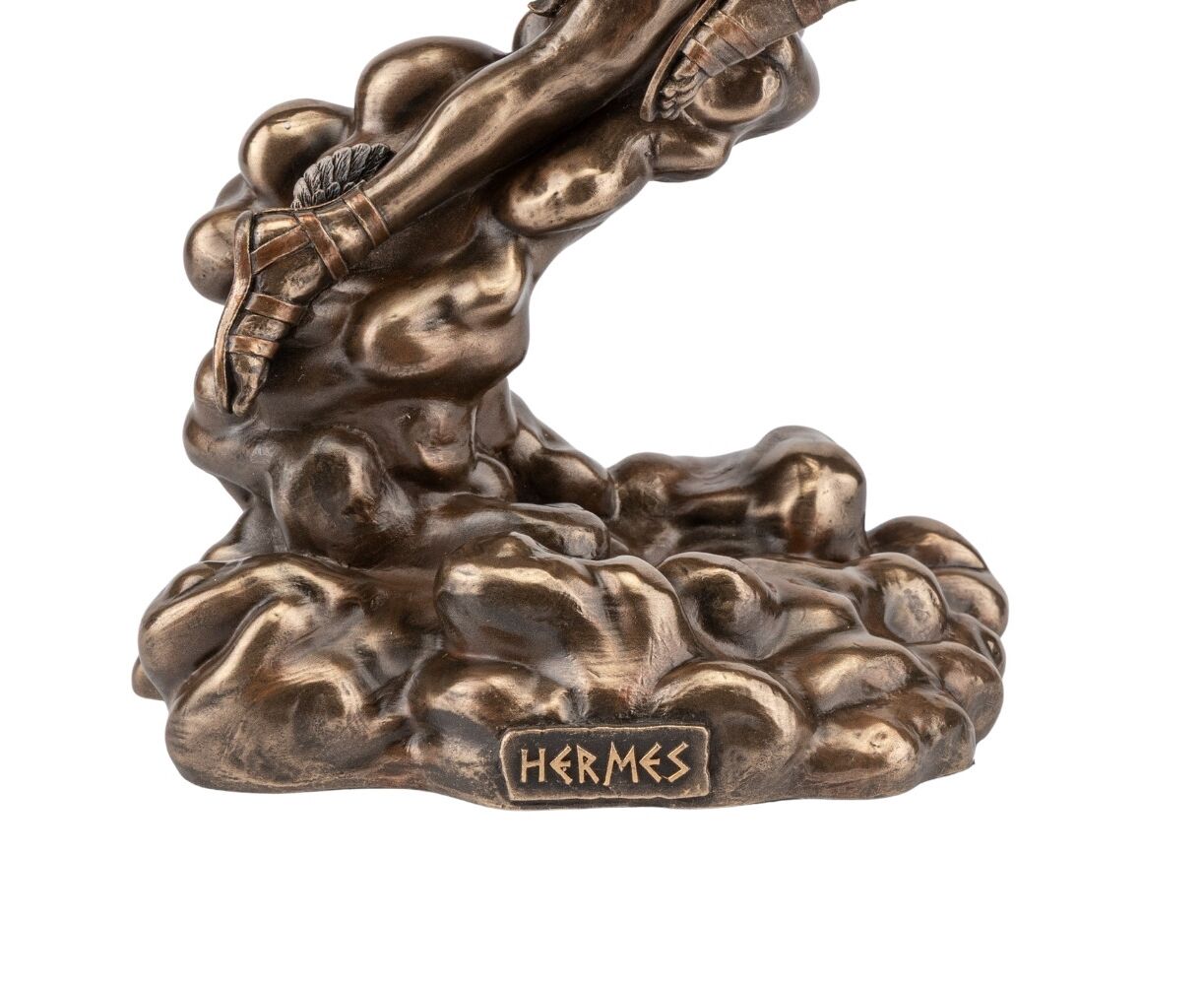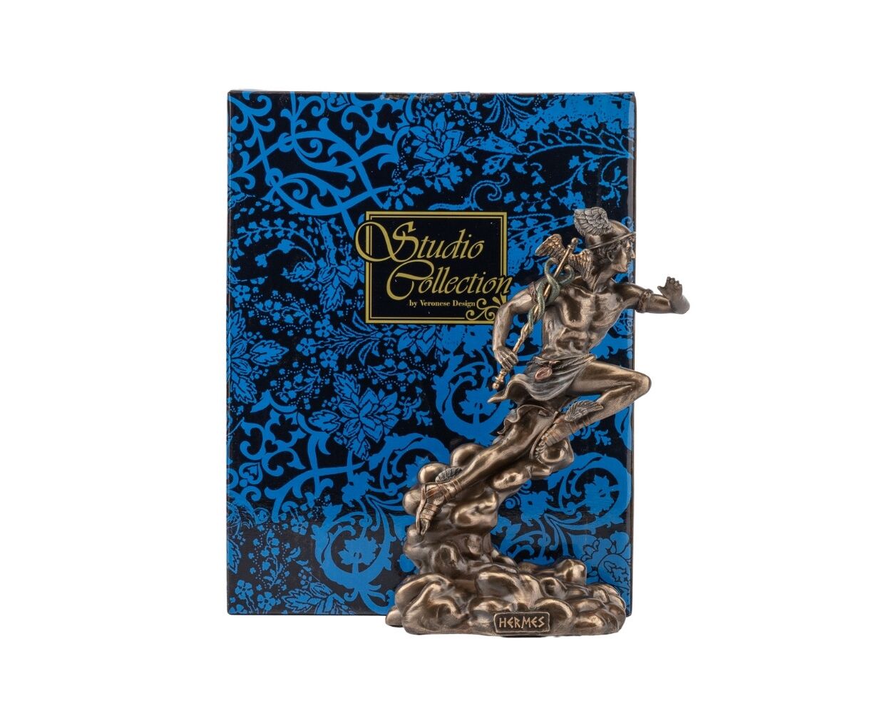 Гермес, согласно греческой мифологии, вестник богов, проводник умерших, покровитель путников. Он посредник между миром живых и миром мертвых. Боги часто изъявляли свою волю людям с помощью снов, поэтому Гермес насылал на людей вещие сны. Его считают изобретателем музыкального инструмента – лиры. Он был весельчаком и любил устраивать розыгрыши. Статуэтка "Гермес" изготовлена из полистоуна (искусственного камня) и покрыта бронзовым напылением. Запакована в пенопласт и красивую подарочную упаковку. VERONESE