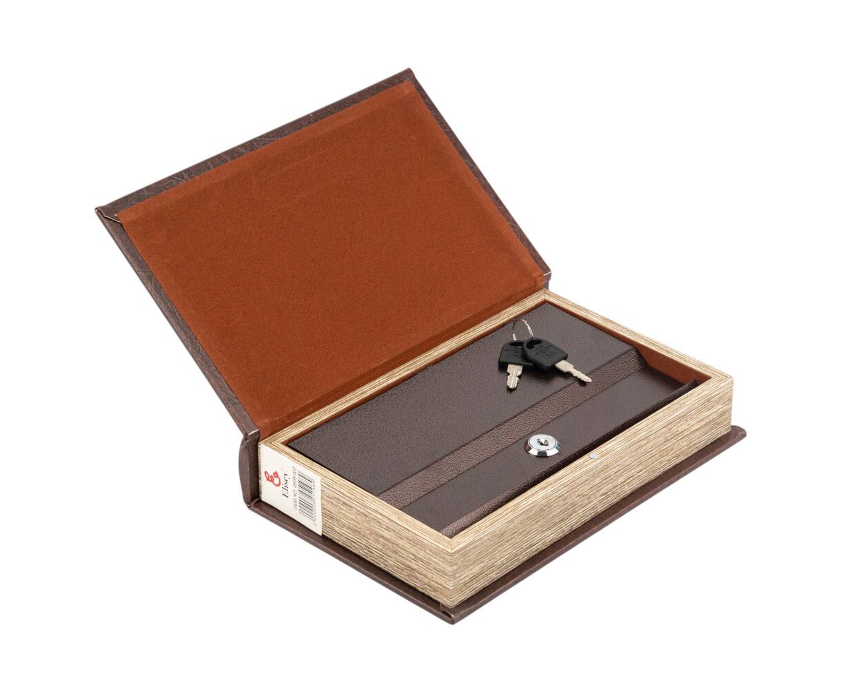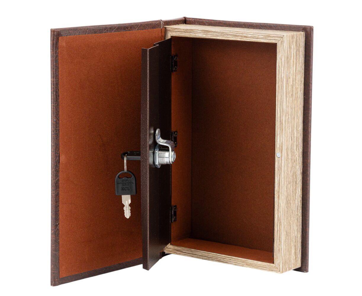 Высота - 26 см, длина - 17 см, ширина - 5 см. Книга-сейф – это креативный интерьерный элемент, который выглядит как обычная книга, но фактически имеет внутреннее хранилище. Это скрытая система хранения денег, документов или других ценных вещей. Внутри сейф закрывается на замок компактными ключами, которые легко можно спрятать в укромном месте. Это не только функциональная и полезная в повседневной жизни вещь, но и непревзойденный, уникальный вид. Благодаря своему внешнему виду, книга-сейф легко вписывается в книжную полку и дополняет любой интерьер. Отличный подарок для друзей и коллег.