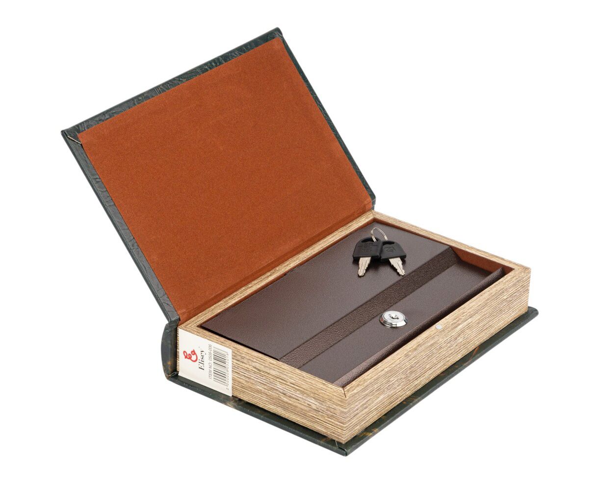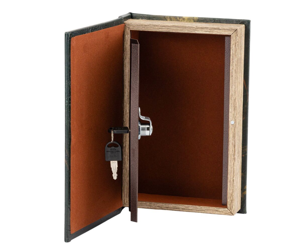 Высота - 26 см, длина - 17 см, ширина - 5 см. Книга-сейф – это креативный интерьерный элемент, который выглядит как обычная книга, но фактически имеет внутреннее хранилище. Это скрытая система хранения денег, документов или других ценных вещей. Внутри сейф закрывается на замок компактными ключами, которые легко можно спрятать в укромном месте. Это не только функциональная и полезная в повседневной жизни вещь, но и непревзойденный, уникальный вид. Благодаря своему внешнему виду, книга-сейф легко вписывается в книжную полку и дополняет любой интерьер. Отличный подарок для друзей и коллег.