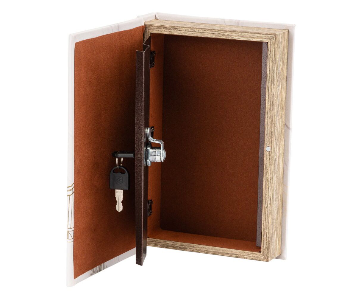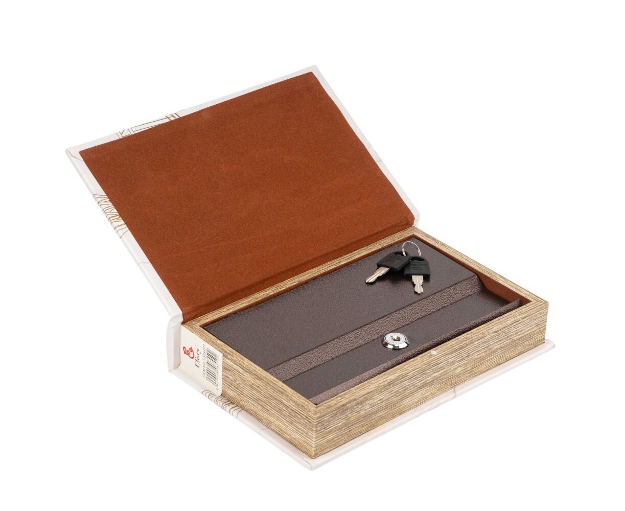 Высота - 26 см, длина - 17 см, ширина - 5 см. Книга-сейф – это креативный интерьерный элемент, который выглядит как обычная книга, но фактически имеет внутреннее хранилище. Это скрытая система хранения денег, документов или других ценных вещей. Внутри сейф закрывается на замок компактными ключами, которые легко можно спрятать в укромном месте. Это не только функциональная и полезная в повседневной жизни вещь, но и непревзойденный, уникальный вид. Благодаря своему внешнему виду, книга-сейф легко вписывается в книжную полку и дополняет любой интерьер. Отличный подарок для друзей и коллег.