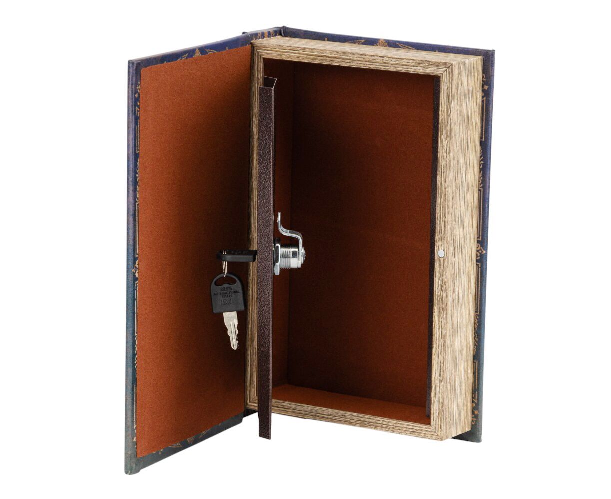 Высота - 26 см, длина - 17 см, ширина - 5 см. Книга-сейф – это креативный интерьерный элемент, который выглядит как обычная книга, но фактически имеет внутреннее хранилище. Это скрытая система хранения денег, документов или других ценных вещей. Внутри сейф закрывается на замок компактными ключами, которые легко можно спрятать в укромном месте. Это не только функциональная и полезная в повседневной жизни вещь, но и непревзойденный, уникальный вид. Благодаря своему внешнему виду, книга-сейф легко вписывается в книжную полку и дополняет любой интерьер. Отличный подарок для друзей и коллег.