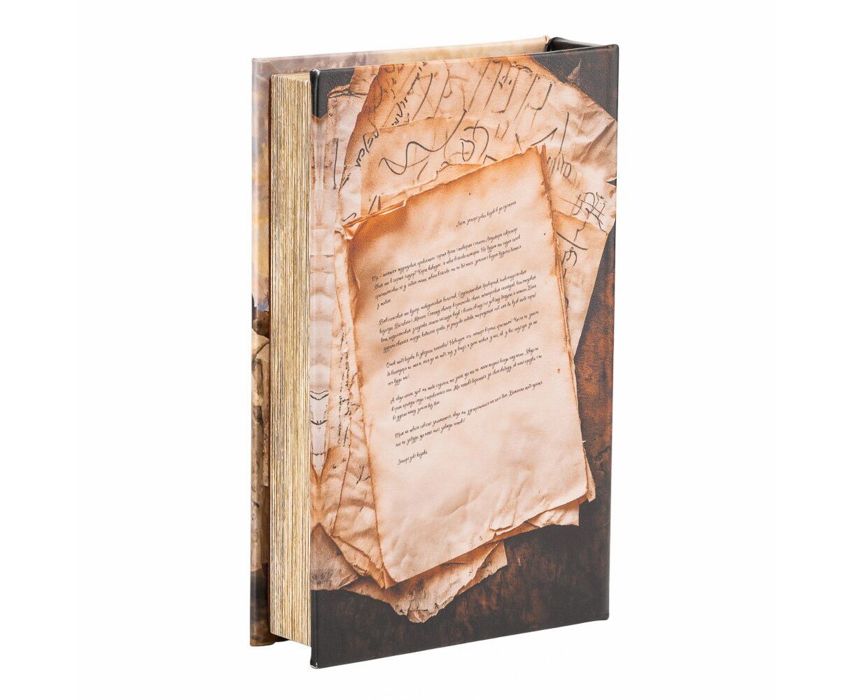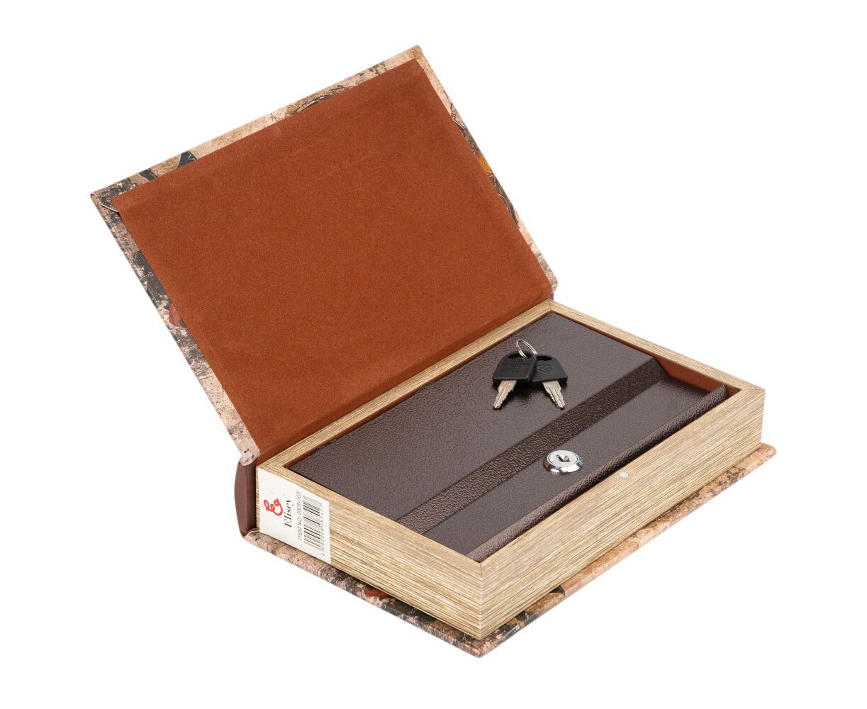 Высота - 26 см, длина - 17 см, ширина - 5 см. Книга-сейф – это креативный интерьерный элемент, который выглядит как обычная книга, но фактически имеет внутреннее хранилище. Это скрытая система хранения денег, документов или других ценных вещей. Внутри сейф закрывается на замок компактными ключами, которые легко можно спрятать в укромном месте. Это не только функциональная и полезная в повседневной жизни вещь, но и непревзойденный, уникальный вид. Благодаря своему внешнему виду, книга-сейф легко вписывается в книжную полку и дополняет любой интерьер. Отличный подарок для друзей и коллег.