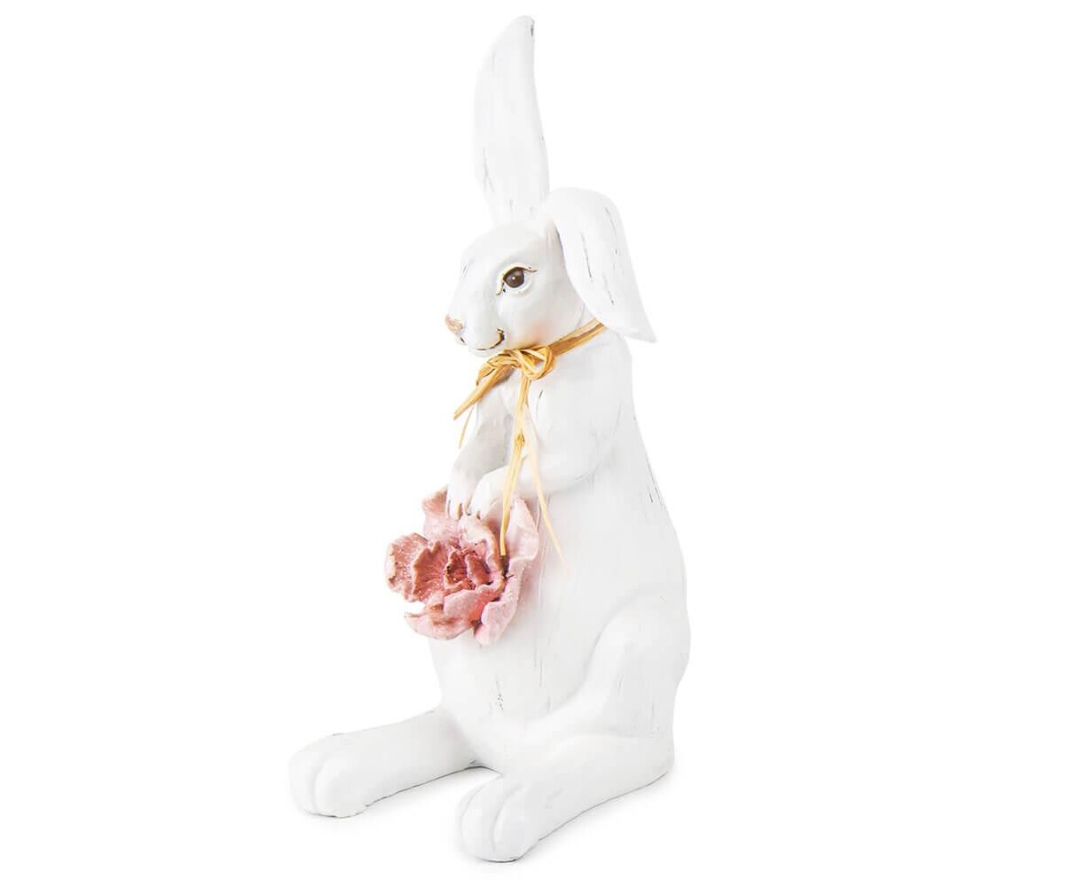 Фигурка белой крольчихи - это отличный вариант декора на Пасху и не только! Крольчиха необычайной красоты и качественного исполнения будет радовать глаз круглый год и дарить каждому дому блага и уют. Крольчиха выполнена из качественного материала - полистоуна, белого цвета, держит в лапках розу и имеет на шее соломенный бантик. Фигурка устойчиво стоит.