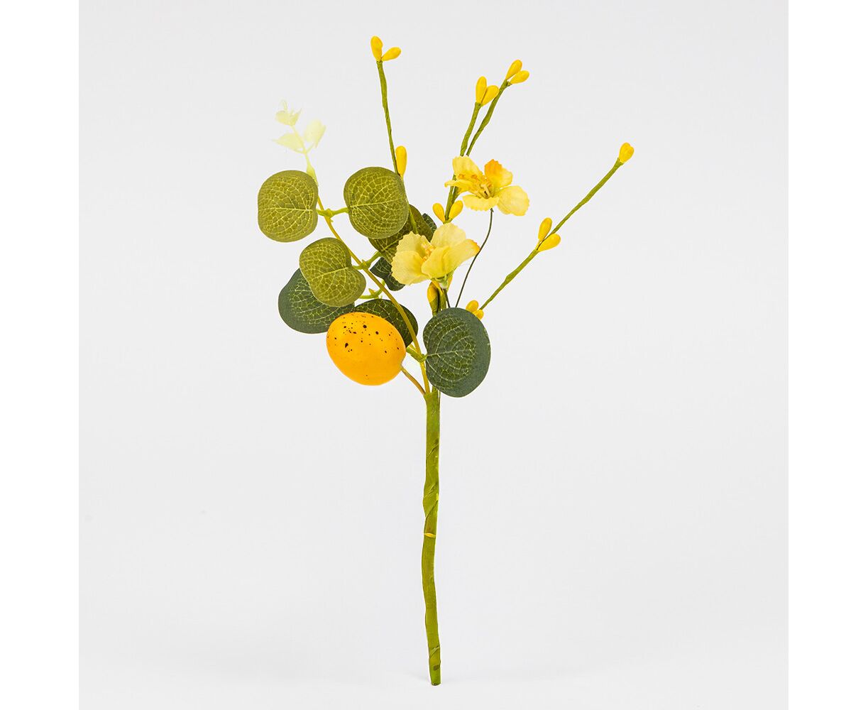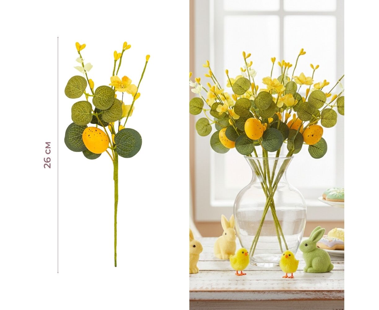 Высота — 26 см. Яркий и жизнерадостный элемент декора, который мгновенно придает пространству праздничное настроение. Композиция состоит из насыщенно-желтых цветов, выразительных листьев эвкалипта и декоративной крашанки солнечного оттенка с характерным рисунком. Дополнительные побеги с мелкими желтыми соцветиями создают объем и завершенность образа. Благодаря компактному размеру и сочной палитре, веточка станет отличным дополнением к профессиональным флористическим инсталляциям, оформлению витрин кафе или магазинов, а также для уютного домашнего декора в стиле кантри или прованс.