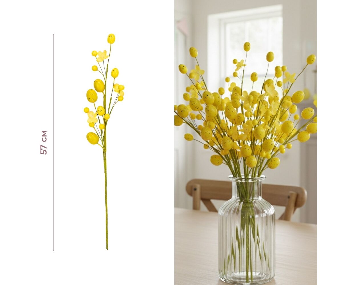 Высота — 57 см. Декоративная веточка «Желтые крашанки» — лаконичный и стильный элемент пасхального декора. Композиция состоит из изящных побегов, украшенных мелкими желтыми цветами и декоративными пасхальными яйцами в крапинку сочного лимонного цвета. Благодаря вертикальному формату и монохромной яркой палитре, она станет идеальным акцентом для праздничного стола, дополнением весенних букетов или частью флористических композиций в HoReCa.