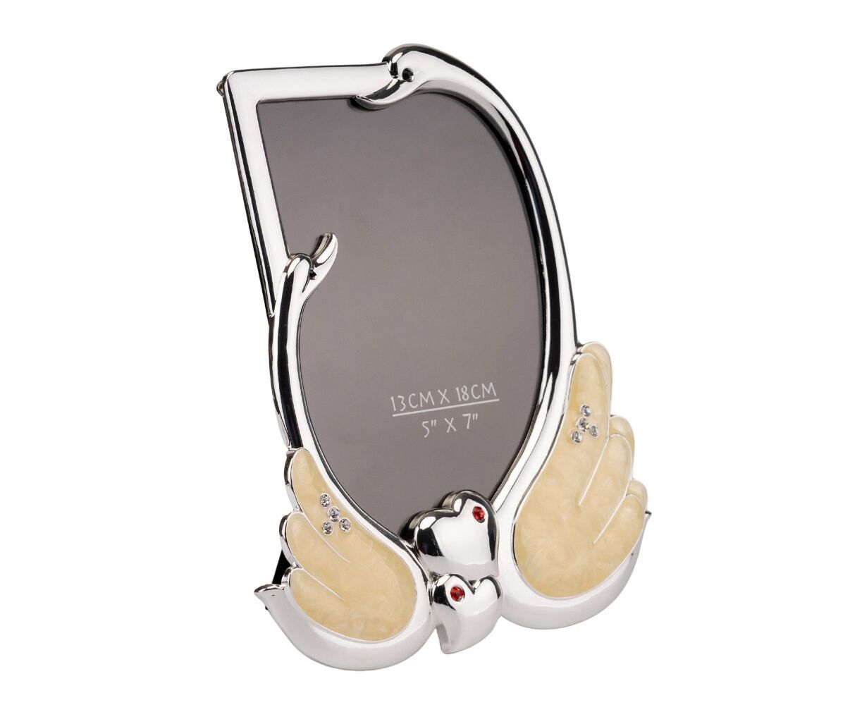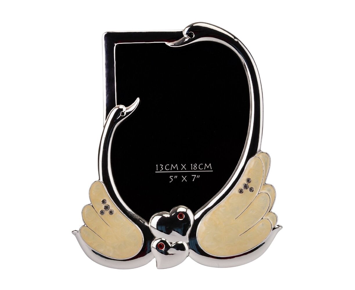 Фоторамка "Лебеди" красивейшая фоторамка стального цвета украшена парой лебедей – символом вечной любви и верности. Такая фоторамка именно то, что нужно для достойного обрамления свадебных фото. Влюбленные взгляды счастливой пары, красивое белое платье невесты, первый трепетный танец молодой семьи. Волшебный день свадьбы – день рождения семьи. Такие эмоции должны быть запечатлены на фото. Это не просто фоторамка, это идеальный подарок для близкого человека. Она также подойдет на подарок молодоженам, или супруге на годовщину. Им точно понравиться такой знак внимания и на долго сохранить теплые воспоминания.