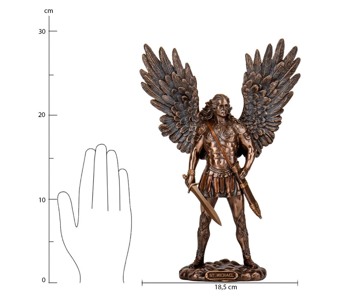 Высота статуэтки – 28 см, ширина – 8,5 см, длина – 18,5 см. Статуэтка Veronese "Архангел Михаил" является символом милости, раскаяния, добродетели и освящения. Такой подарок займет достойное место в доме человека, которого Вы очень цените. Статуэтка изготовлена из полистоуна (искусственного камня) и покрыта бронзовым напылением. Упакована в красивую подарочную коробку. Поэтому, покупая эту статуэтку, Вы получаете ценный и красивый подарок, который не требует дополнения. Благодаря надежной внутренней упаковке, изготовленной из пенопласта с углублениями для мельчайших деталей, Вы можете быть уверены в безопасности при транспортировке. VERONESE