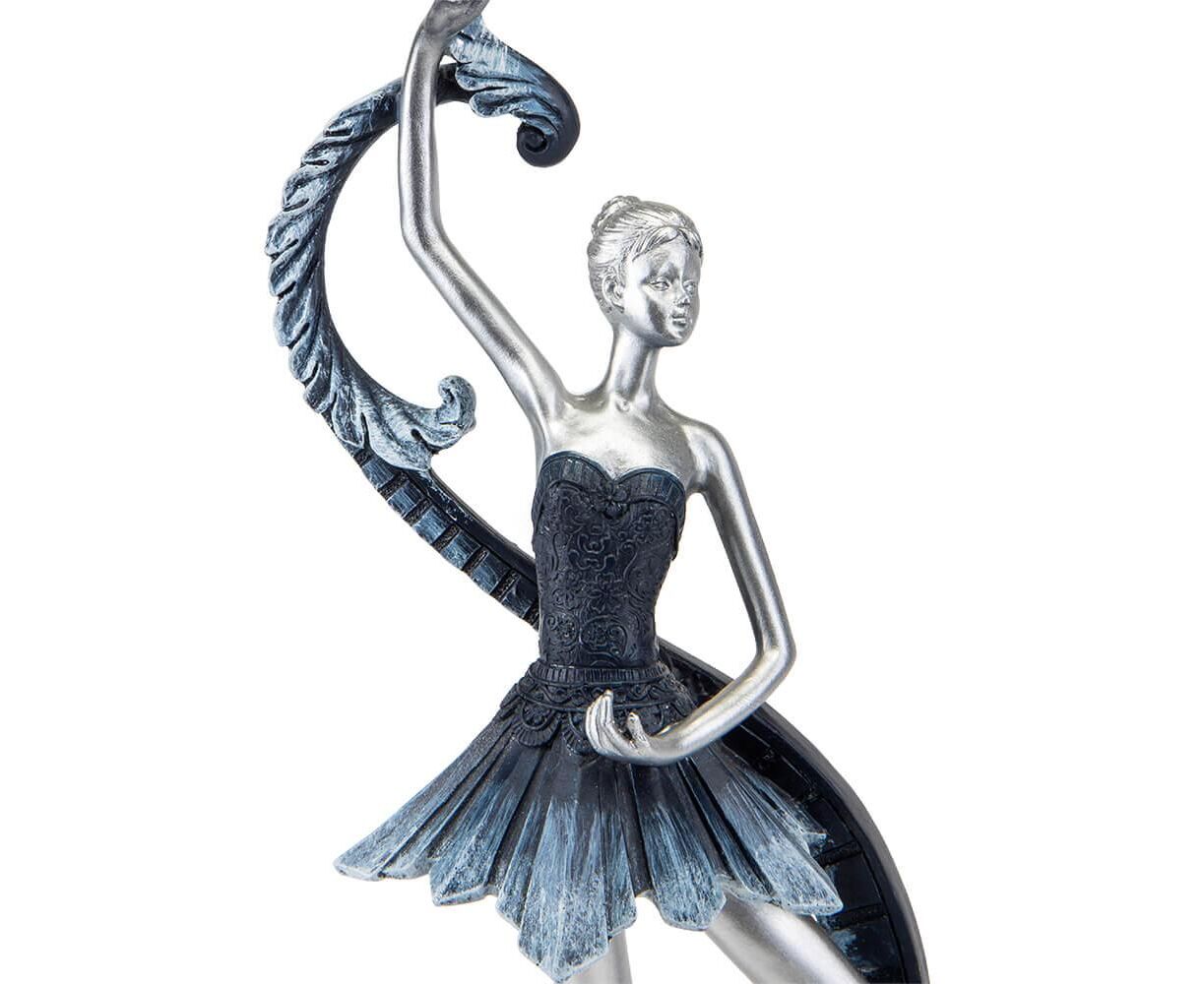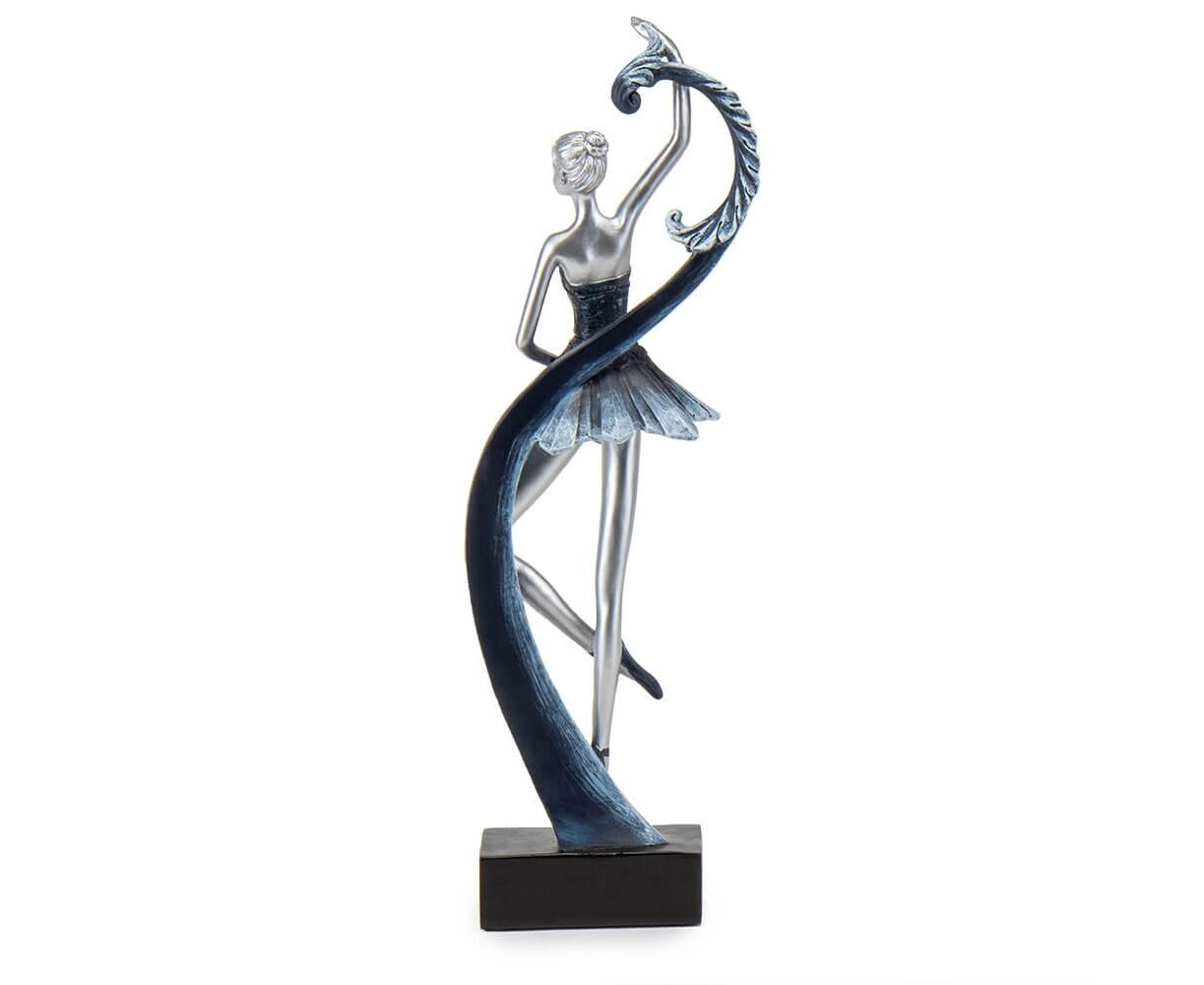 Декоративна фігура балерини викликає неймовірний захват своєю витонченою формою, реалістичними деталями, якістю. Фігурка балерини - це оригінальний декор для будинку і відмінний подарунок для дівчини чи подруги. Поціновувачі балету будуть особливо в захваті! Статуетка має вишуканий зовнішній вигляд, вона виконана з якісного матеріалу - полістоуна, має сріблястий колір і благородний синій наряд балерини. Фігура неухильно стоїть на чорній підставці.