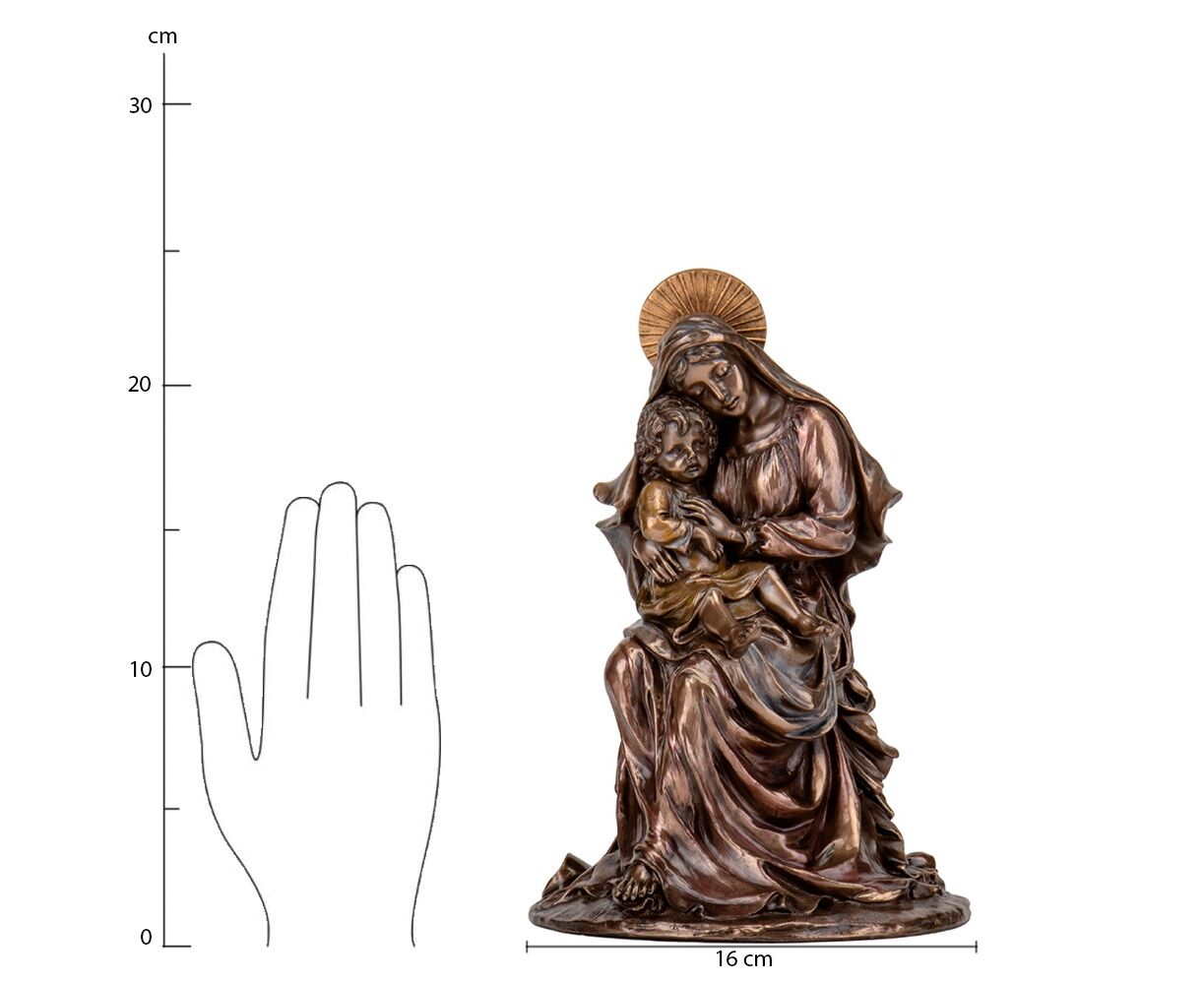 Высота статуэтки - 24 см, длина - 16 см, ширина - 16 см. Статуэтка Veronese изготовлена из полистоуна (искусственного камня) и покрыта бронзовым напылением. Статуэтка Девы Марии с Иисусом – это выразительная символика христианской веры и материнской любви. Эта статуэтка представляет собой утонченное воспроизведение образа Девы Марии, держащей в объятиях Иисуса Христа. Она олицетворяет материнскую нежность, защиту и безграничную любовь. Этот символический подарок может быть важен для верующих христиан, а также для тех, кто ценит красоту и духовность. Статуэтка может служить как источник надежды, утехи и спокойствия в любой ситуации. Упакована в красивую подарочную коробку. Поэтому, покупая эту статуэтку, Вы получаете ценный и красивый подарок, который не требует дополнения. Благодаря надежной внутренней упаковке, изготовленной из пенопласта с углублениями для мельчайших деталей, Вы можете быть уверены в безопасности при транспортировке. VERONESE
