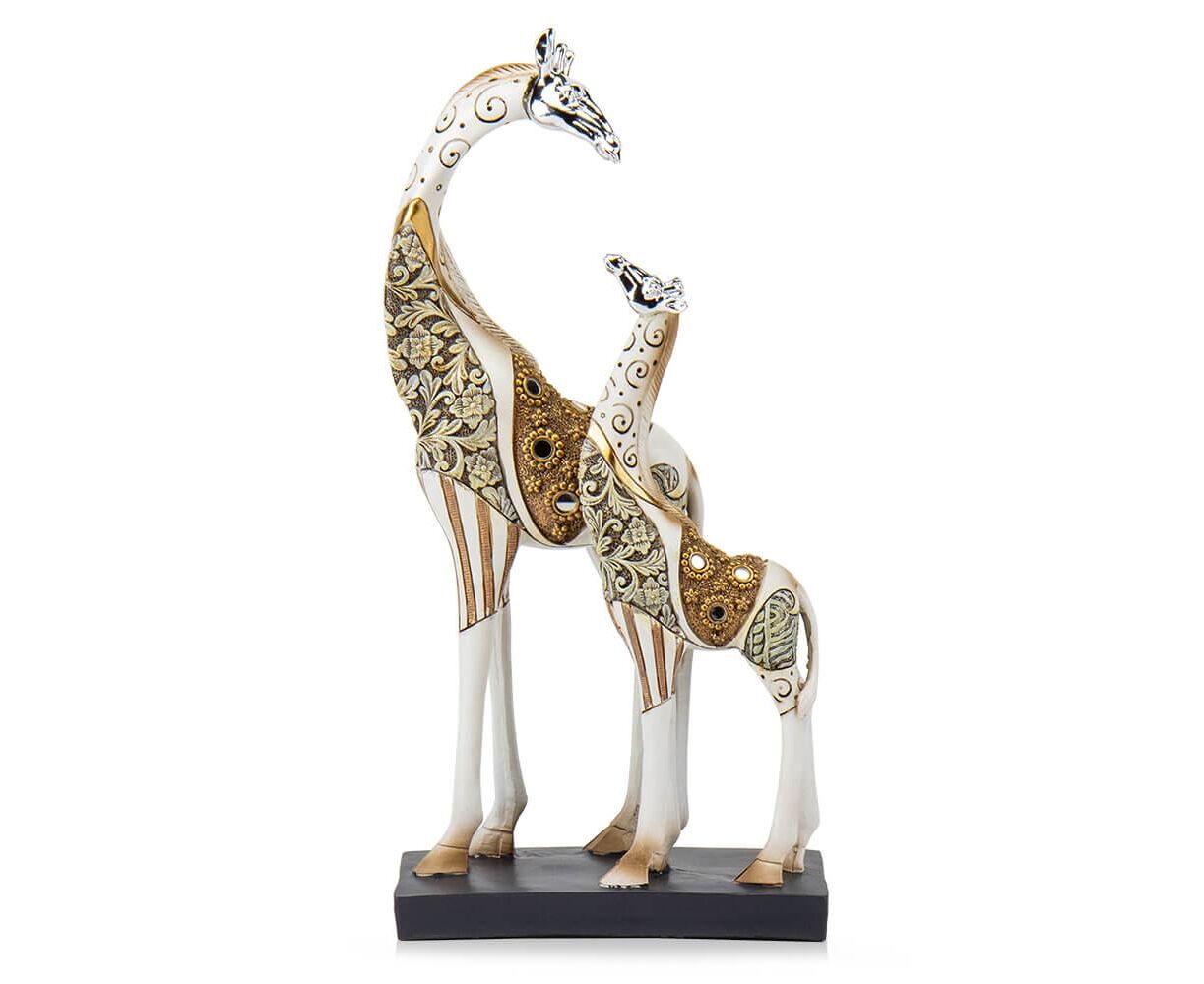 Декоративна статуетка родини жирафів - це витончена, вишукана фігурка з полістона, яка ідеально підходить для подарунка творчій натурі, друзям, колегам. Фігурка дуже красива і прикрасить будь-який інтер'єр. Вона виконана з якісного полістону, має благородний зовнішній вигляд - біла фігурка з золотими Етно візерунками. Статуетка стоїть стабільно.
