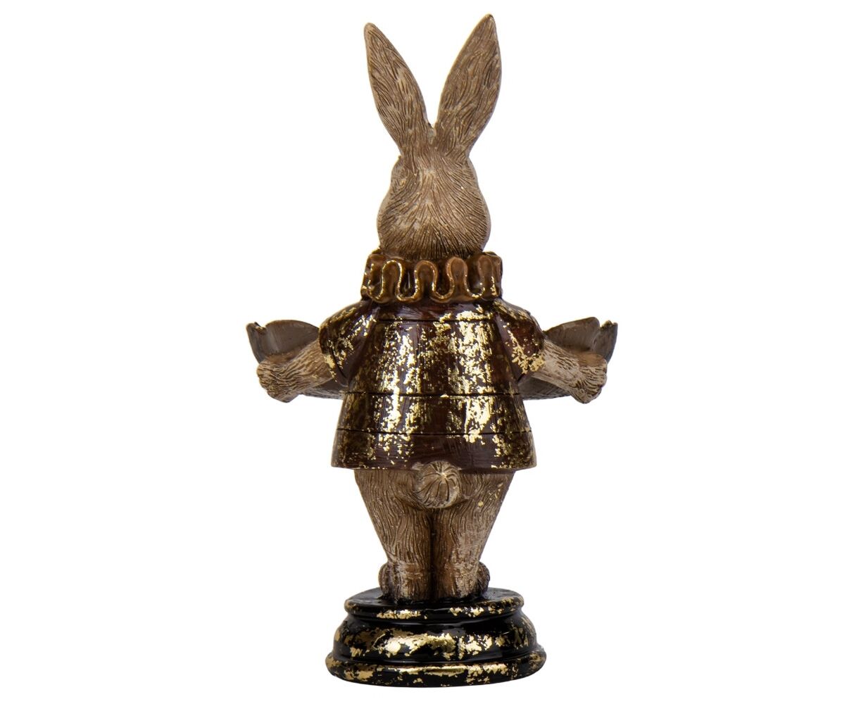 Высота статуэтки – 15 см, длина – 9 см, ширина – 10 см. Декоративная фигурка золотого кролика вызывает невероятный восторг своей элегантной формой, реалистичными деталями, качеством. Это креативный декор для Вашего дома, фотостудии, магазина или кафе. Статуэтка имеет изысканный внешний вид, изготовлена из высококачественного материала – полистоуна, имеет благородный бронзовый цвет. Статуэтка будет вызывать приятные эмоции. Фигурка стойко стоит на подставке.